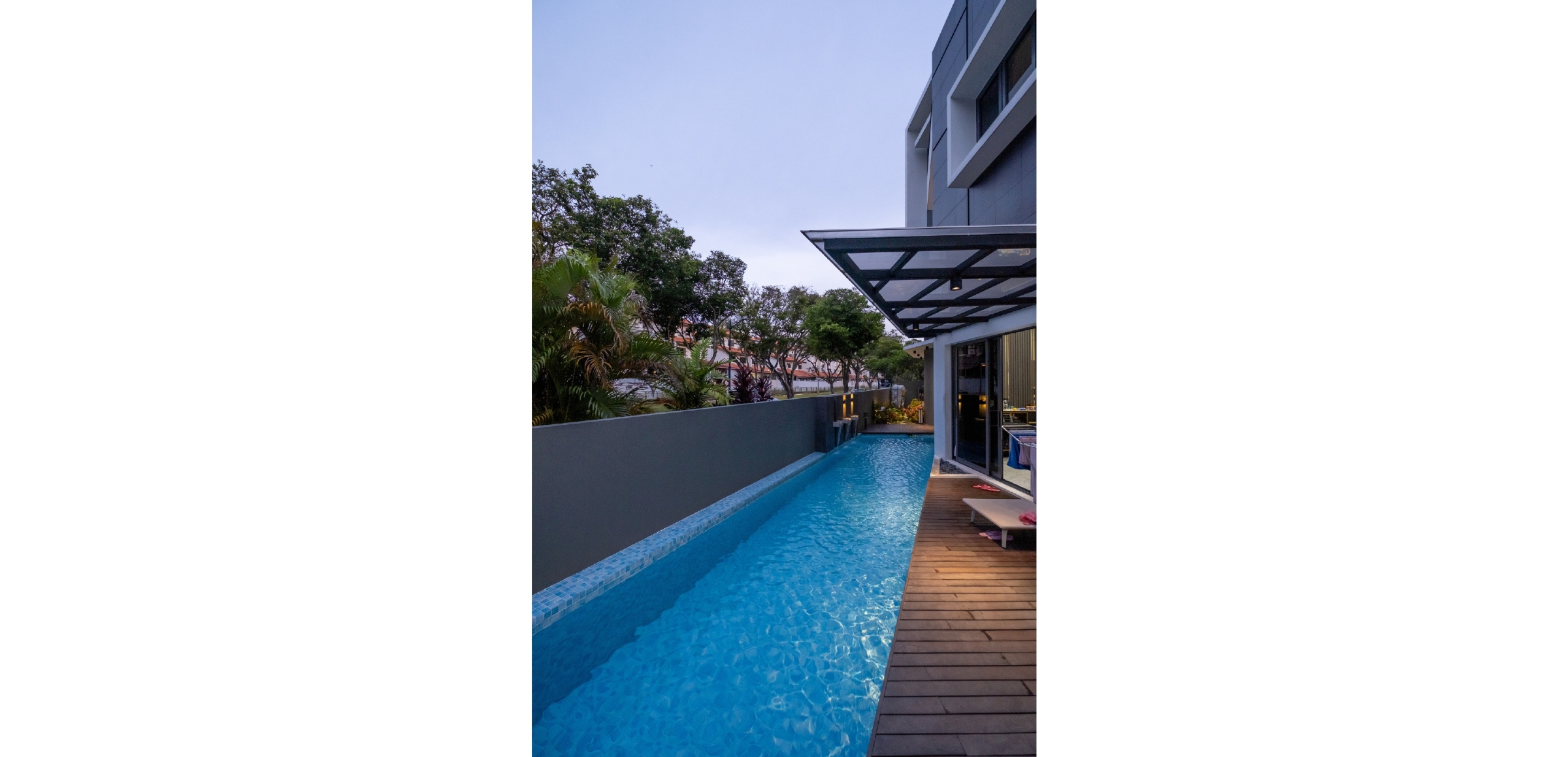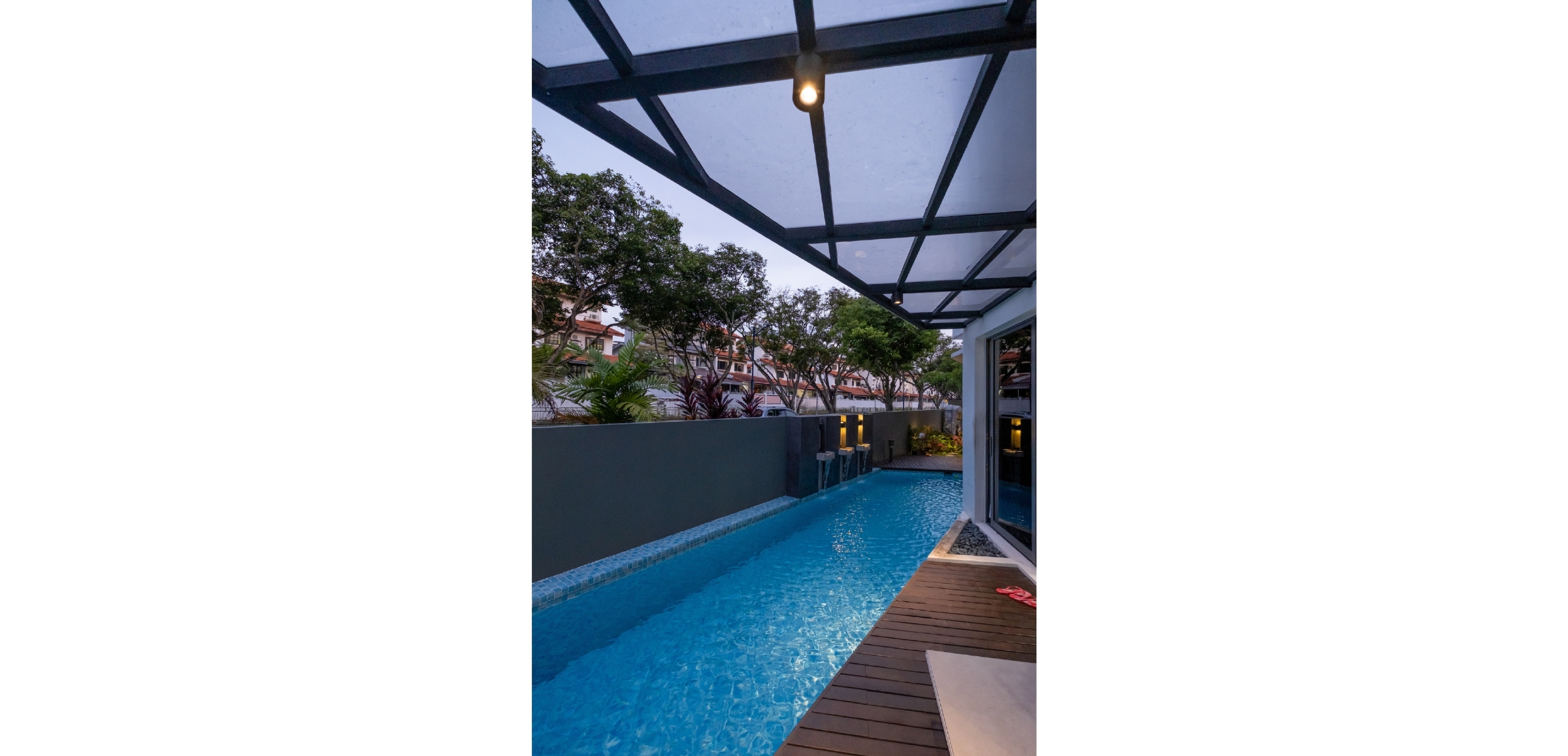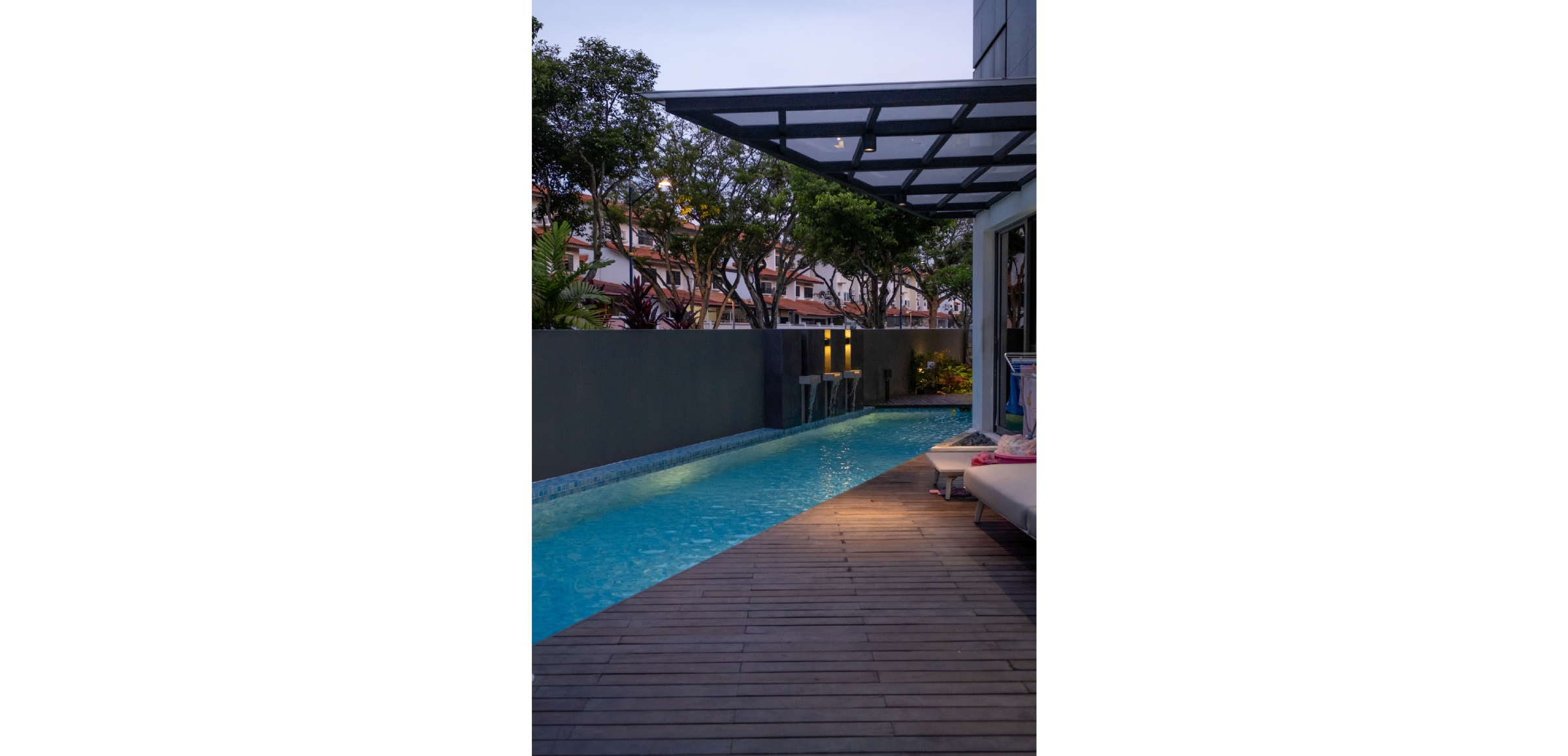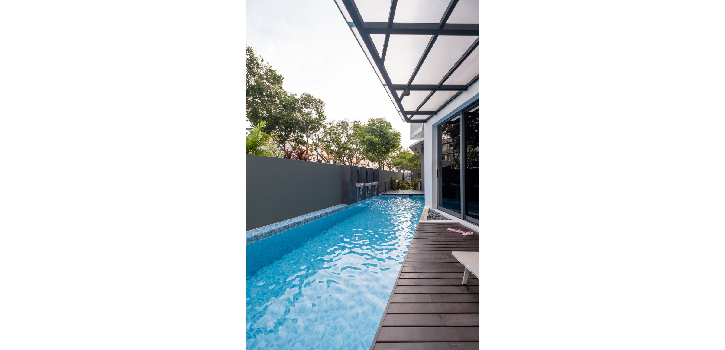 Spanning 2.5 storeys, this residence blends simplicity with tailored functionality. A swimming pool traces the perimeter, seamlessly linking the living and dining spaces. Upstairs, three rooms are designed around a family hall, including a versatile guest room that doubles as a cinematic escape. Occupying the attic is a master bedroom with a private entertainment enclave