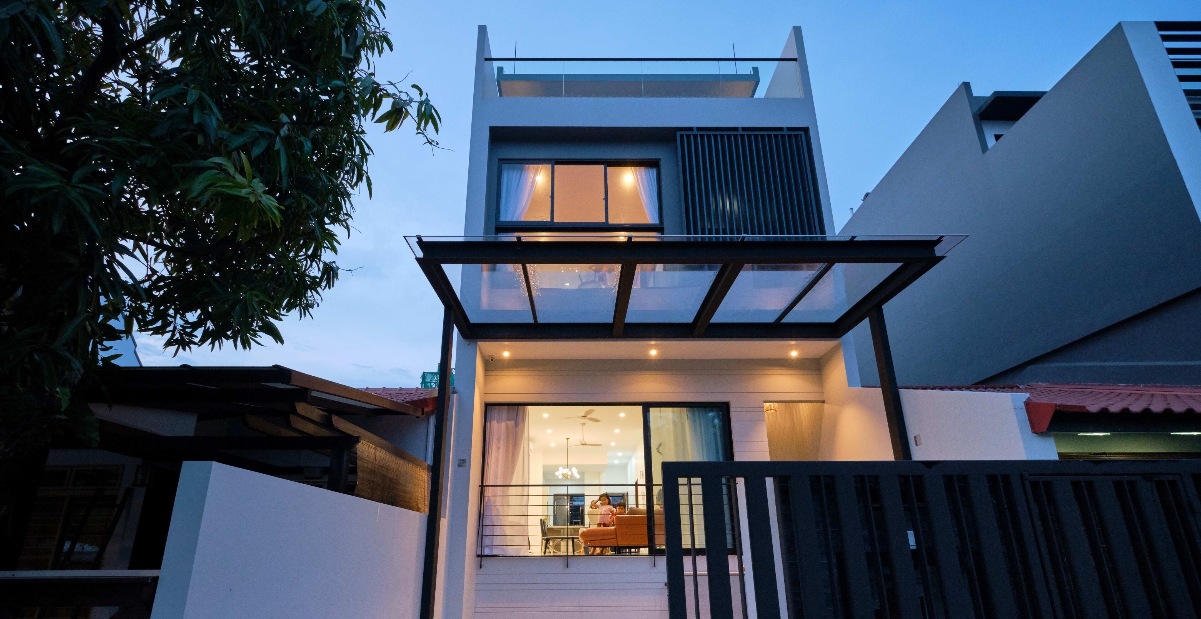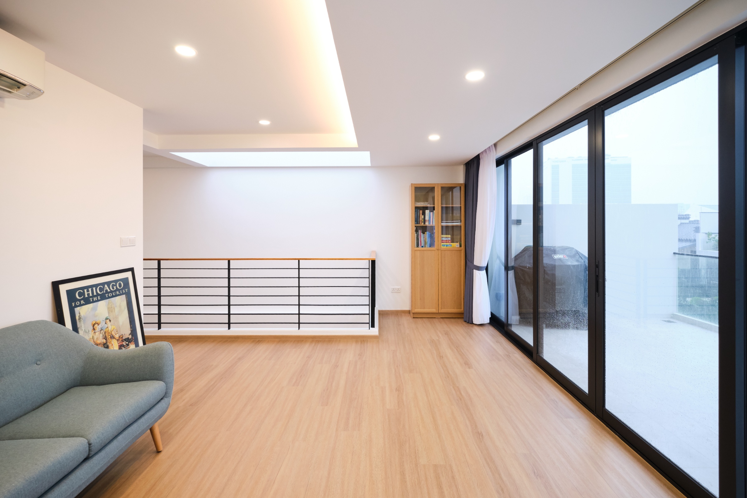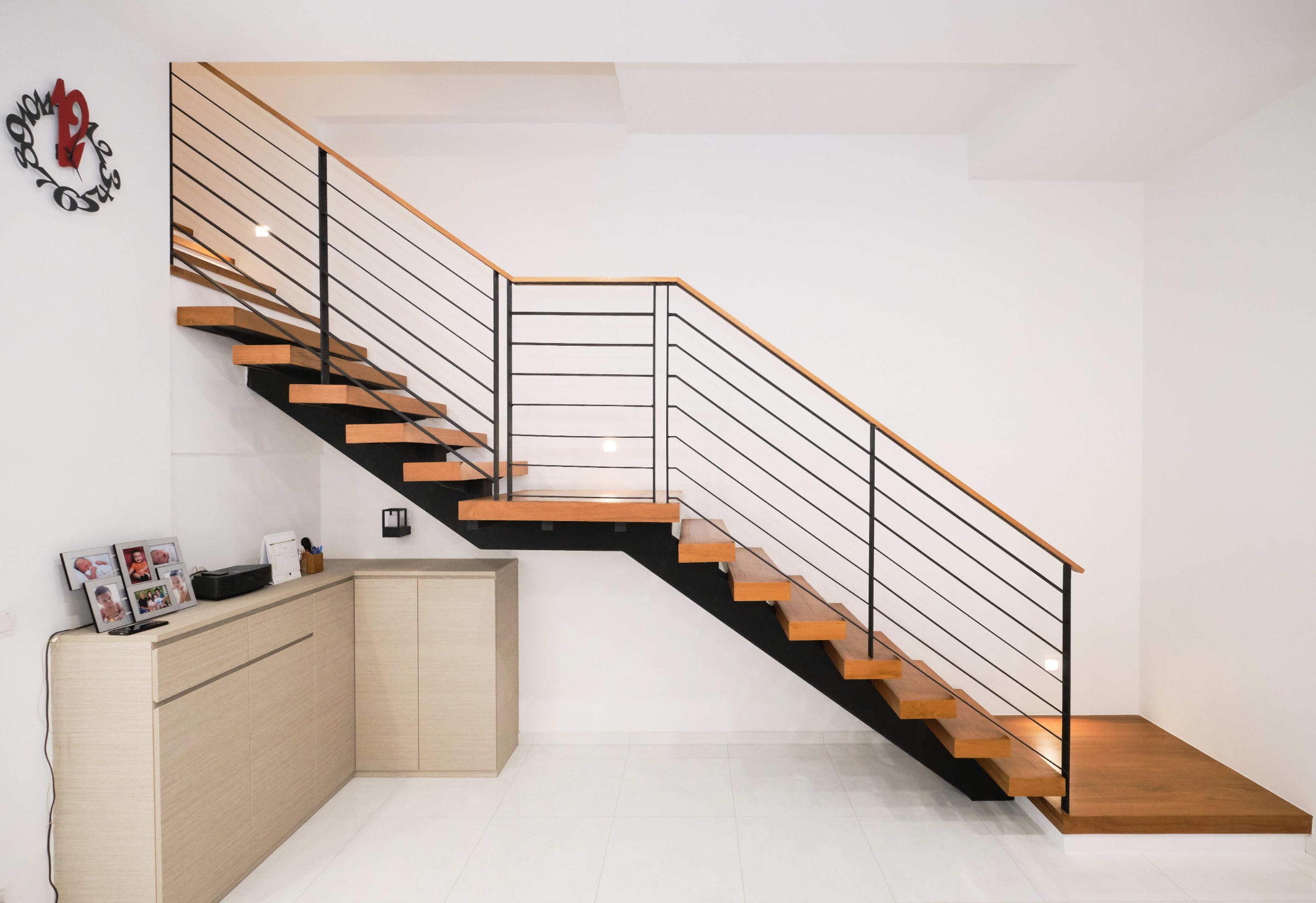 The house was designed with a contemporary aesthetic, and features high ceilings to capitalize on the zoning requirements to build a maximum of 2 storeys. Its modern scandinavian interiors features a 'floating' staircase made of cantilever steps as a key element