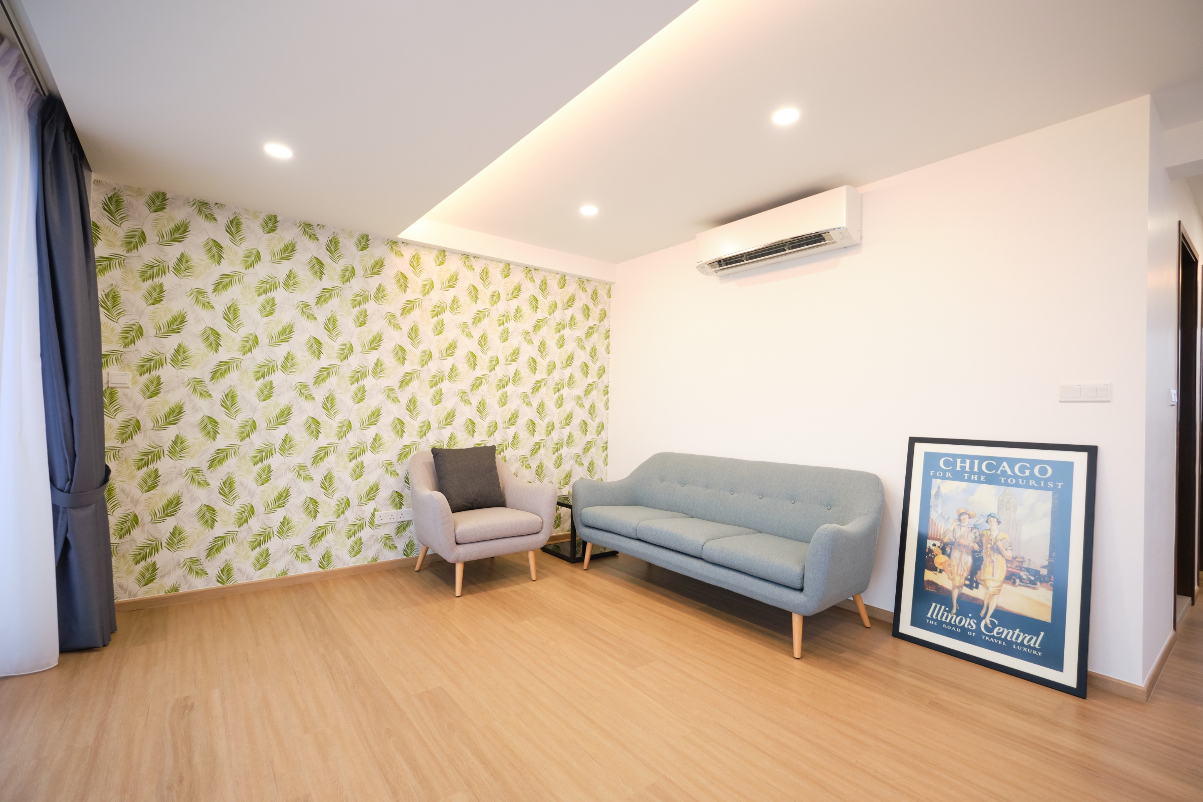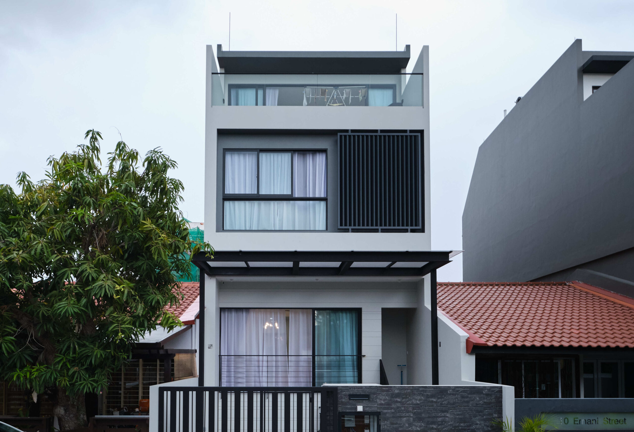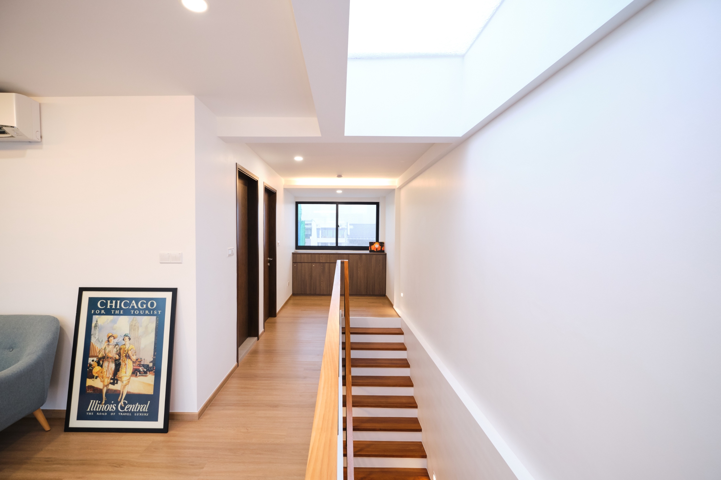 The house was designed with a contemporary aesthetic, and features high ceilings to capitalize on the zoning requirements to build a maximum of 2 storeys. Its modern scandinavian interiors features a 'floating' staircase made of cantilever steps as a key element