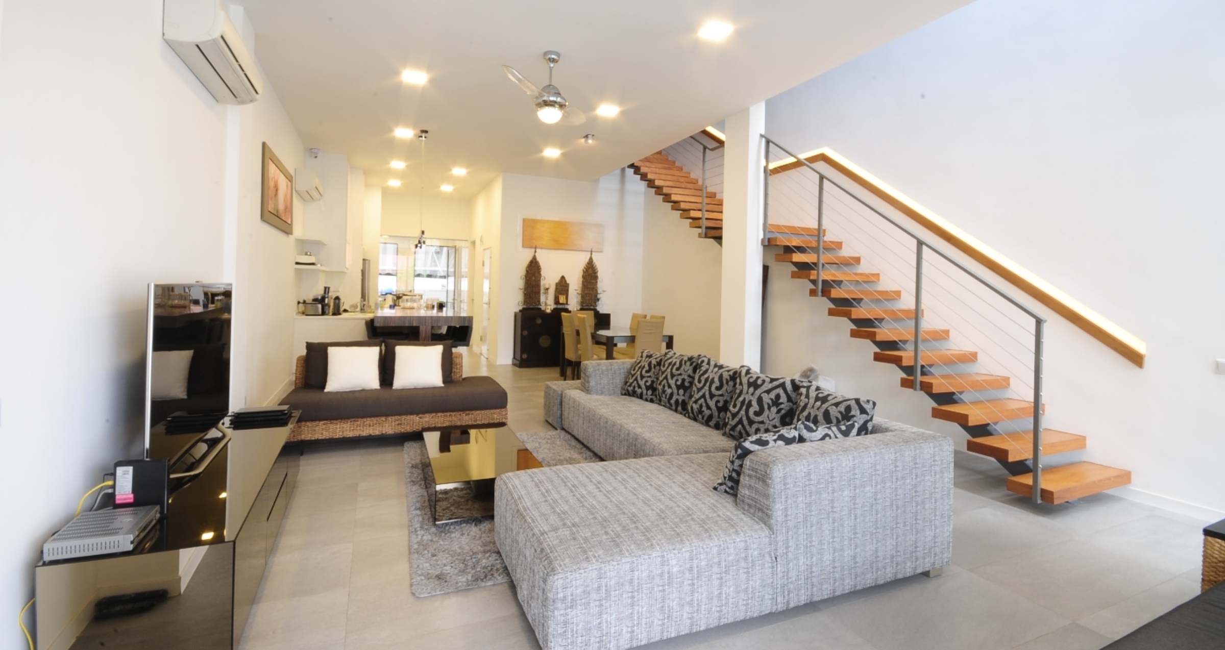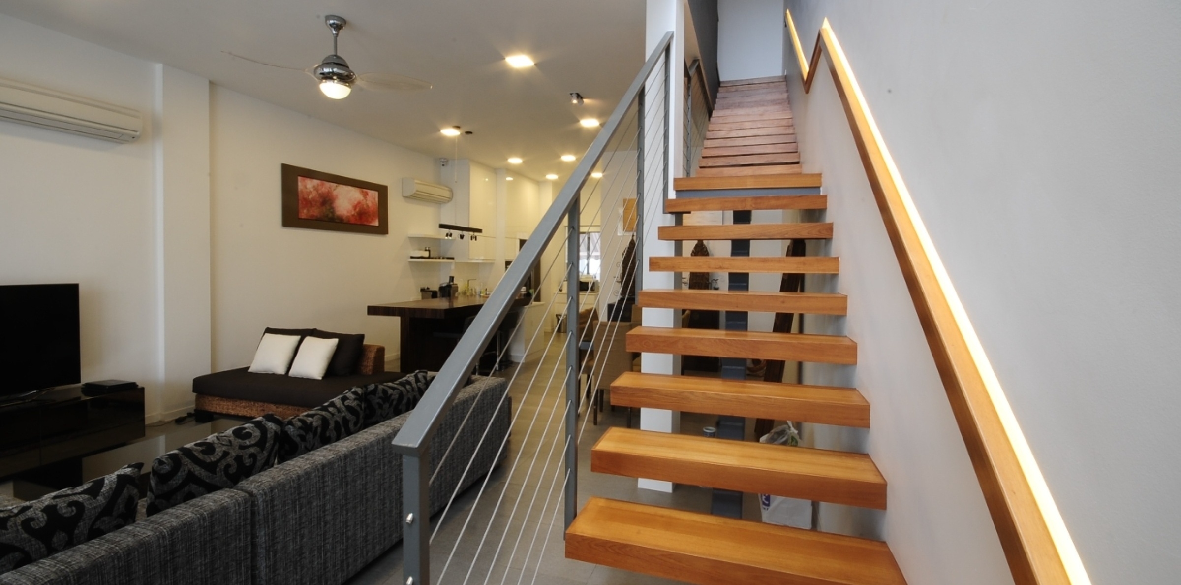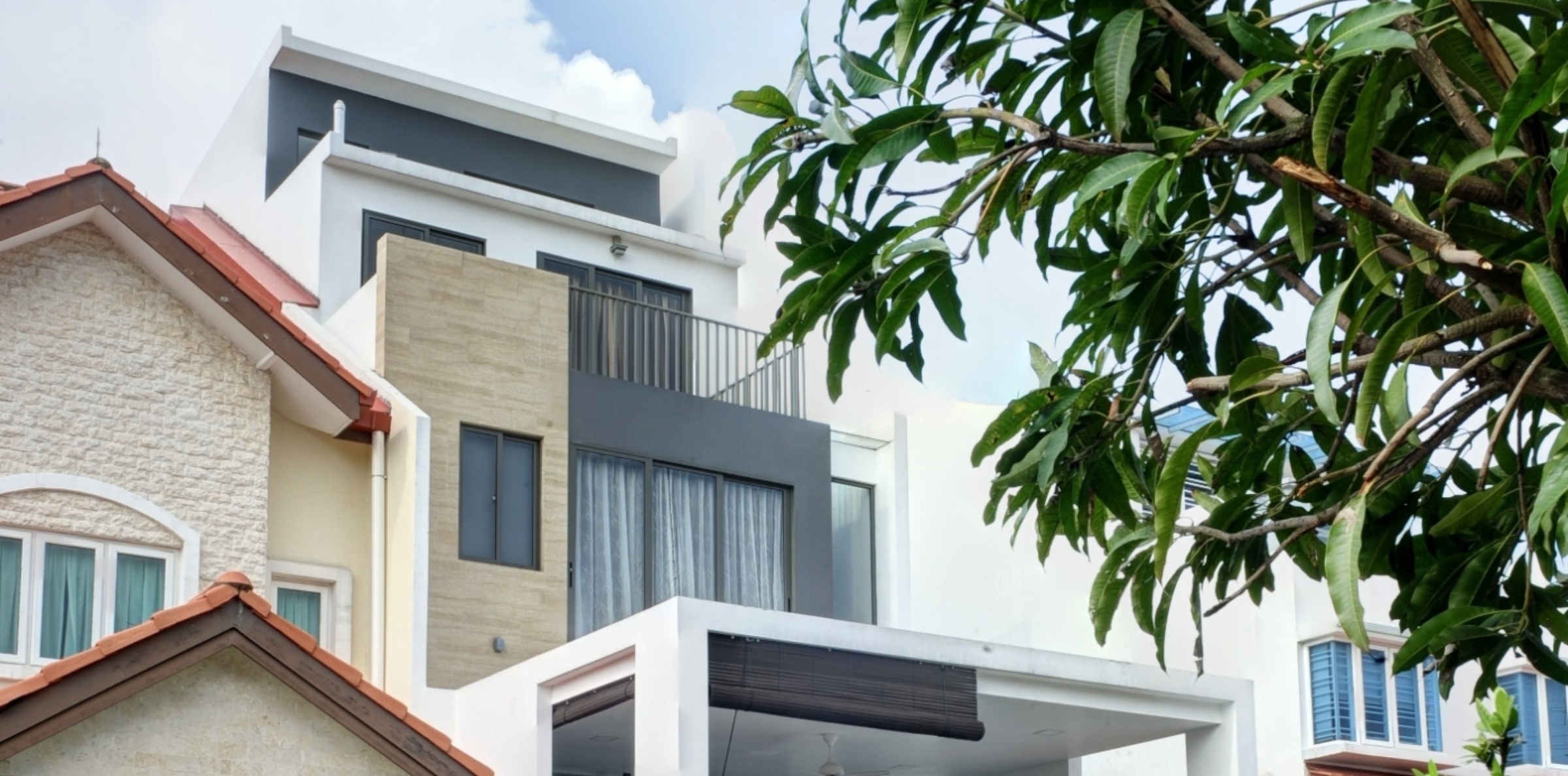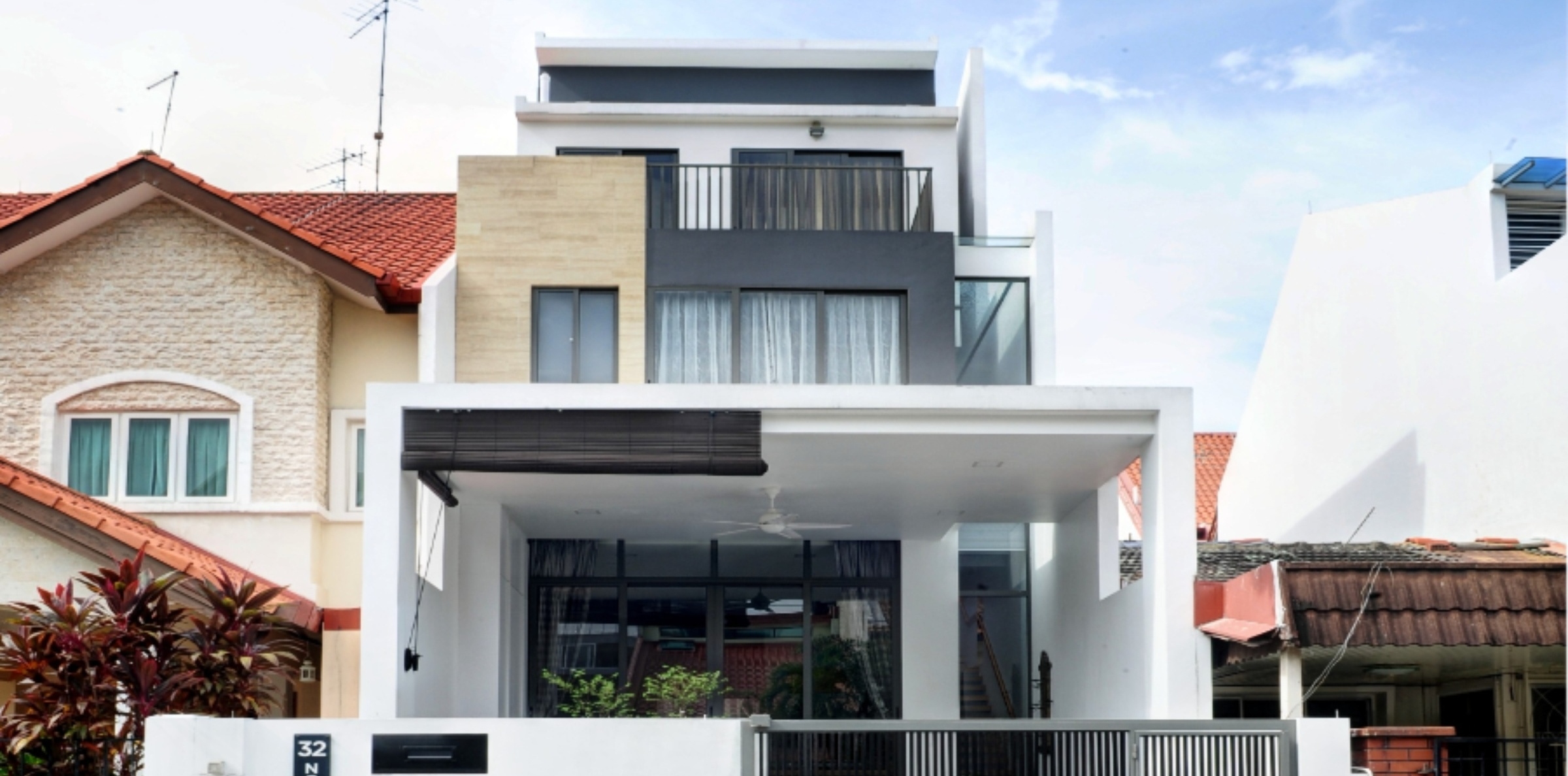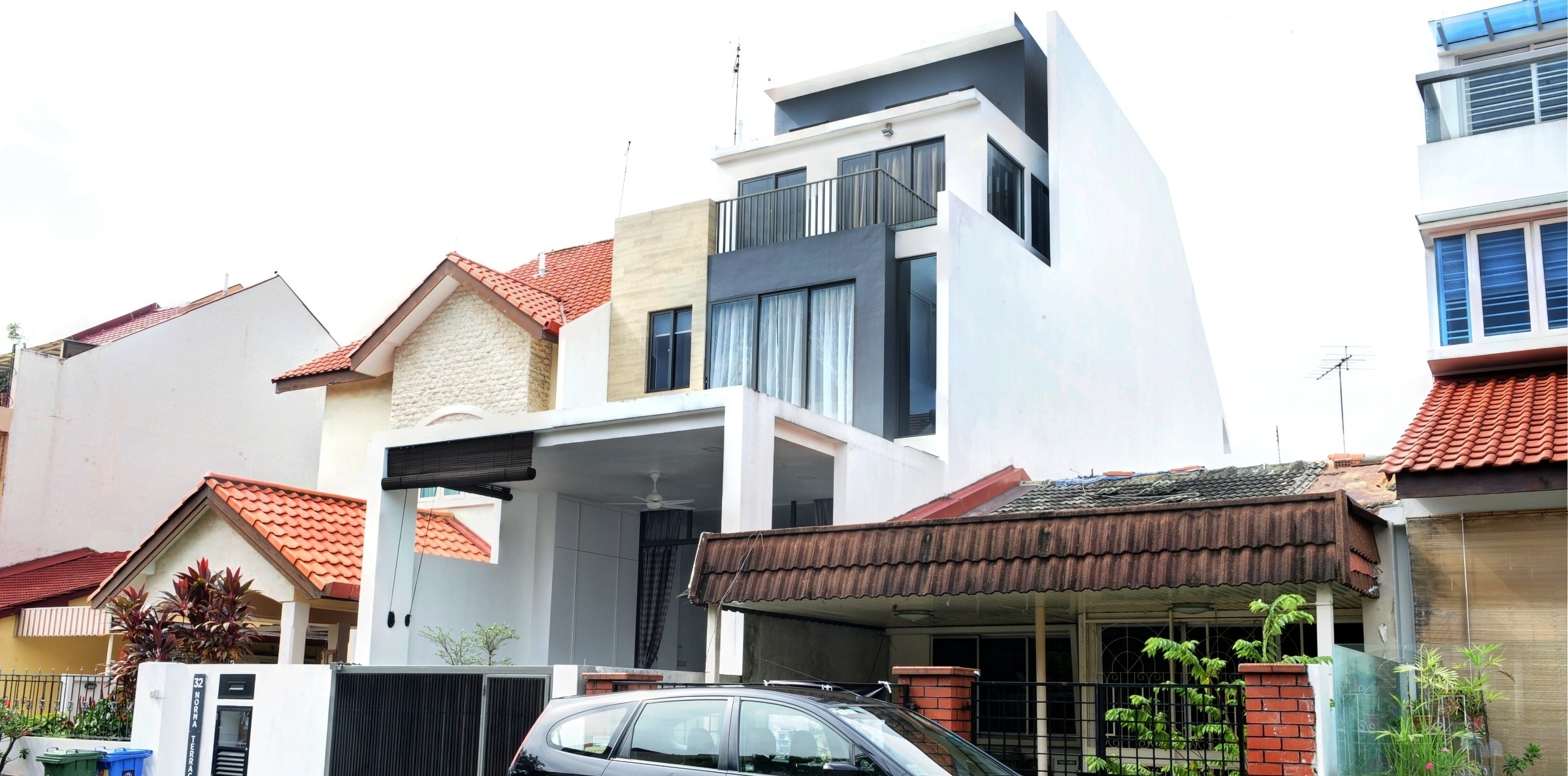 The architecture for Norma Terrace utilizes a modern mimalistic style that sought to maximize the land area as well as the elevation of the built-in area. High ceilings were featured in every floor of the property from 3.2m to 5m on the Attic storey. Internally, an eclectic interior style was used with a cantilever staircase as a key feature