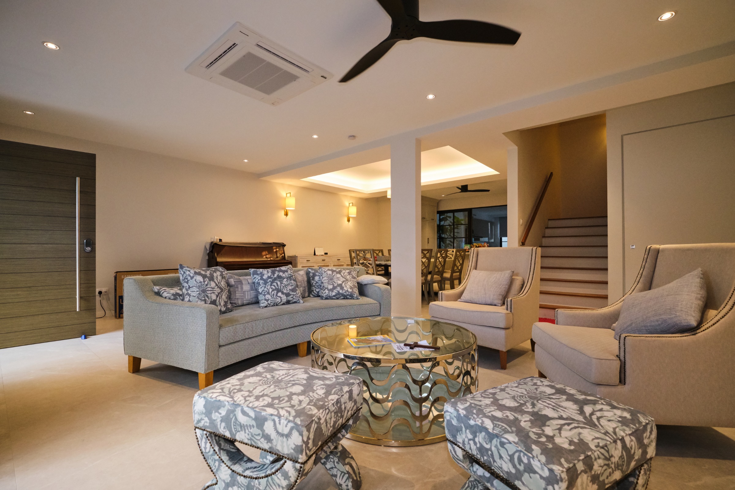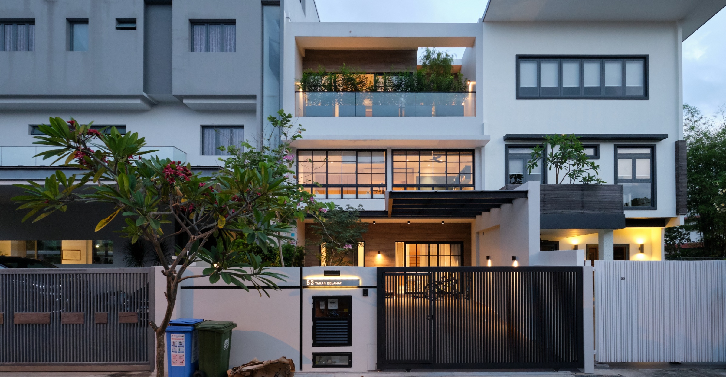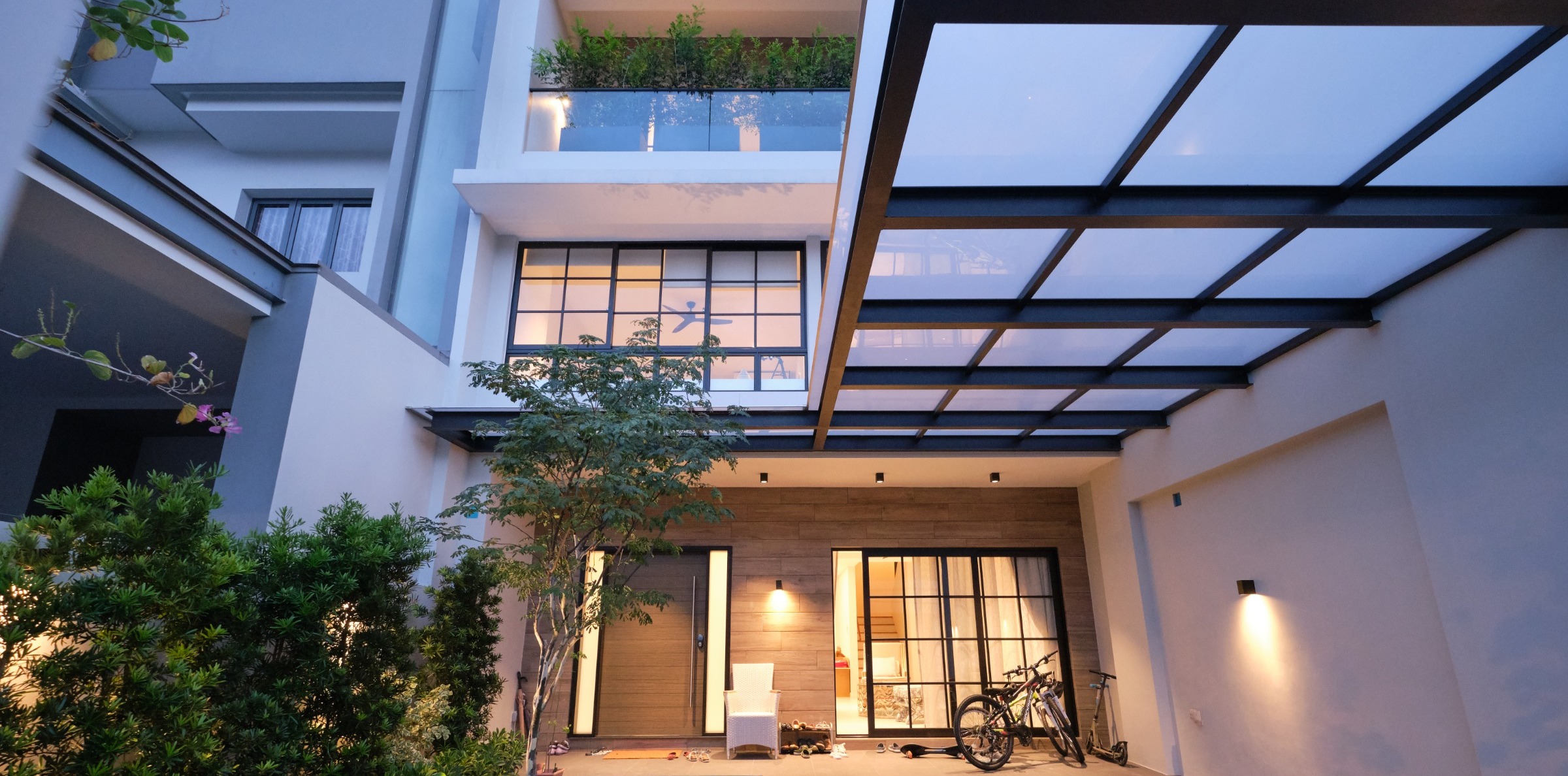 The key reconstruction elements included building a 3rd storey that included an open roof terrace, along with transforming the front facade. A back extension was also done to maximize the plot ratio, with a central courtyard built to relate the design across all storeys. Internally, a modern colonial aesthetic was used
