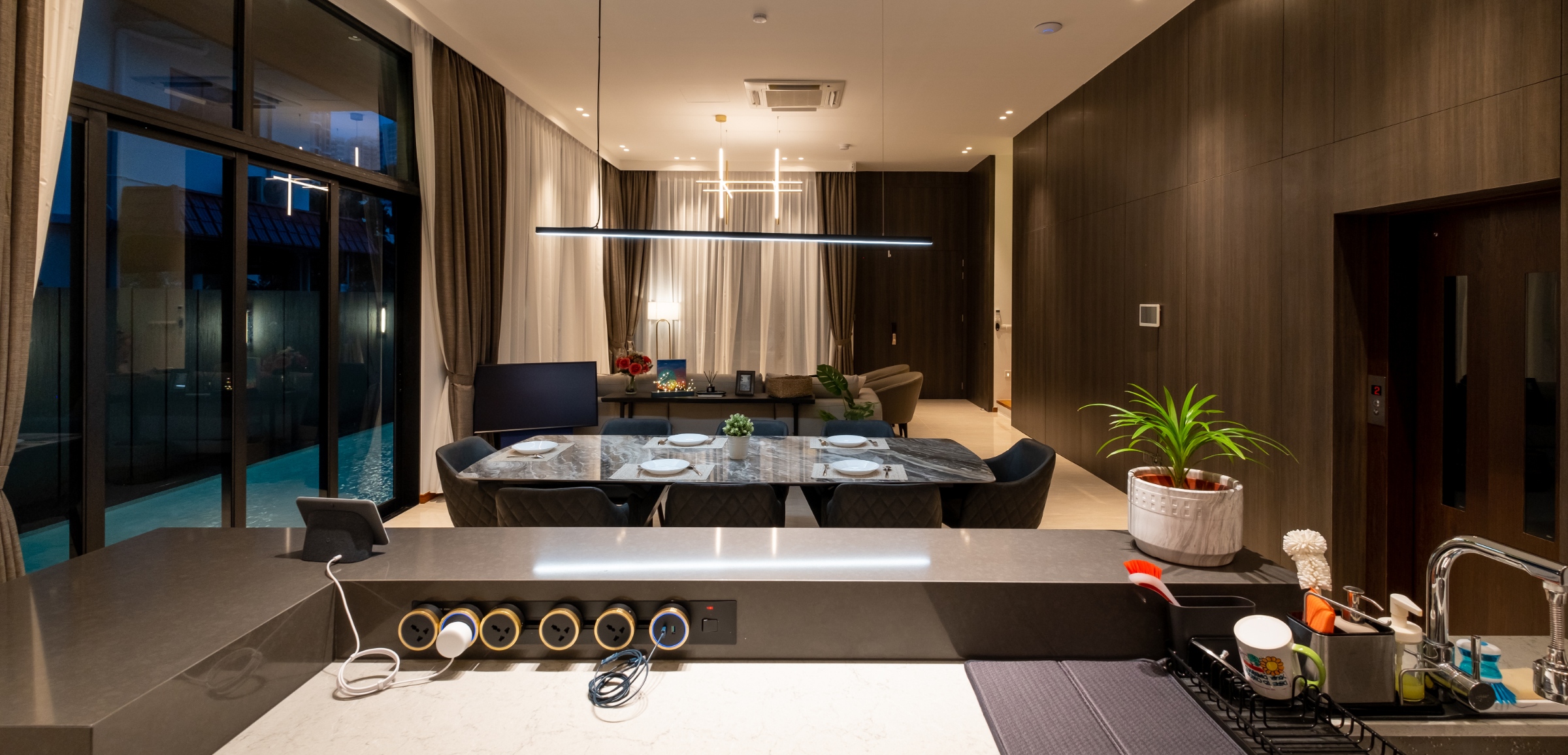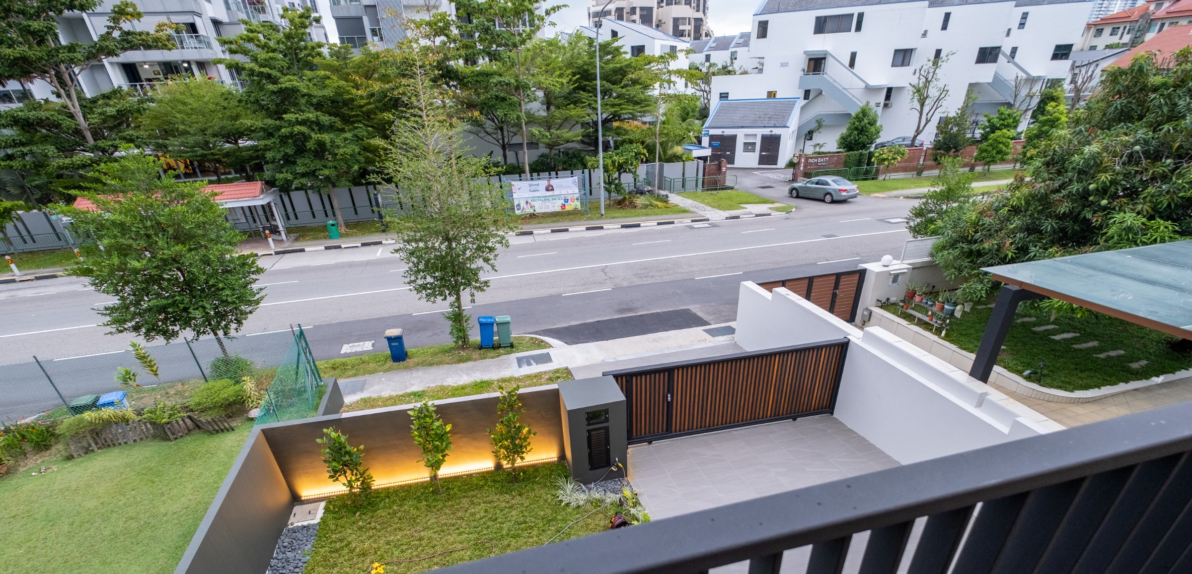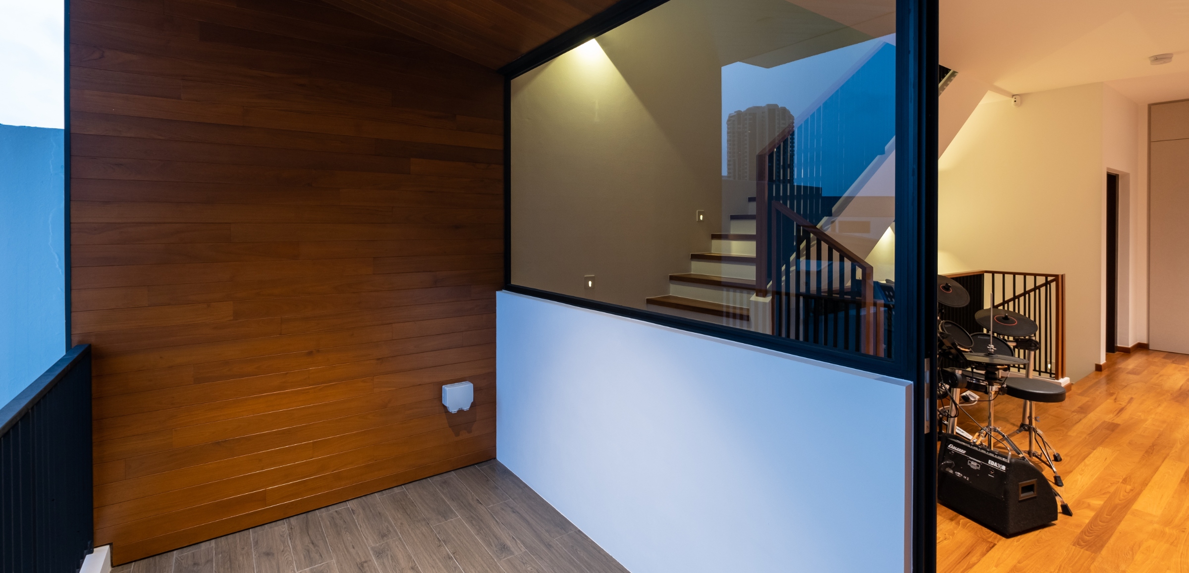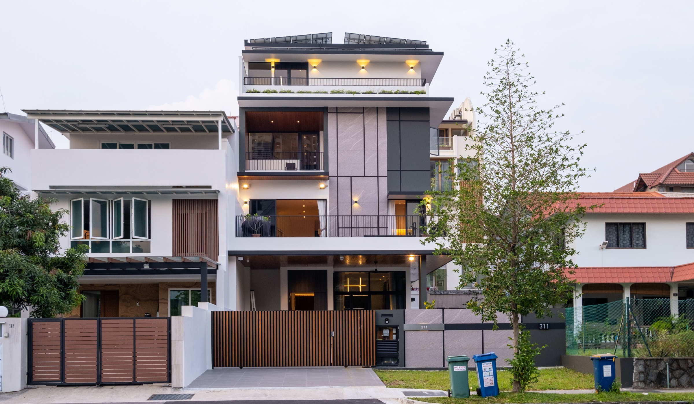 This 3.5-storey residence spans 6,187 sqft and is divided into purposeful levels. The first floor’s open layout encourages gatherings, while the second floor hosts various activities, featuring a game room, guest room, and expansive family area. The upper levels transition into private spaces, including a luxurious master bedroom with an adjoining study at the attic
