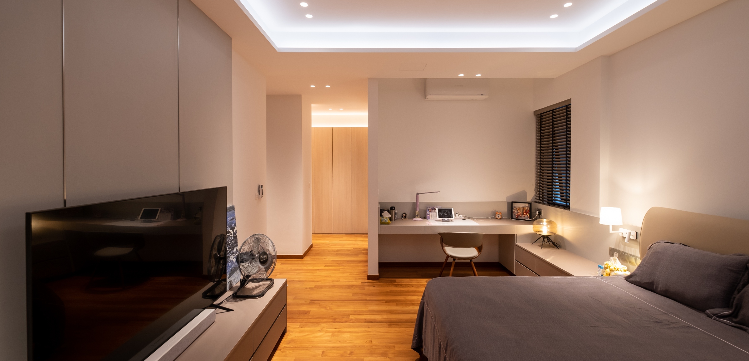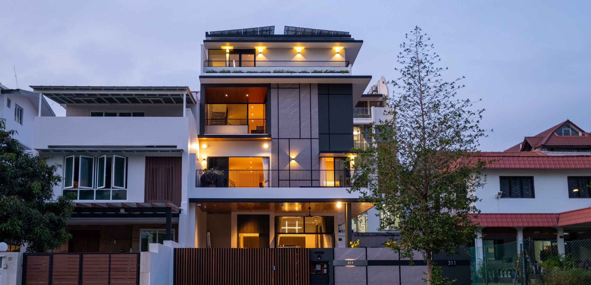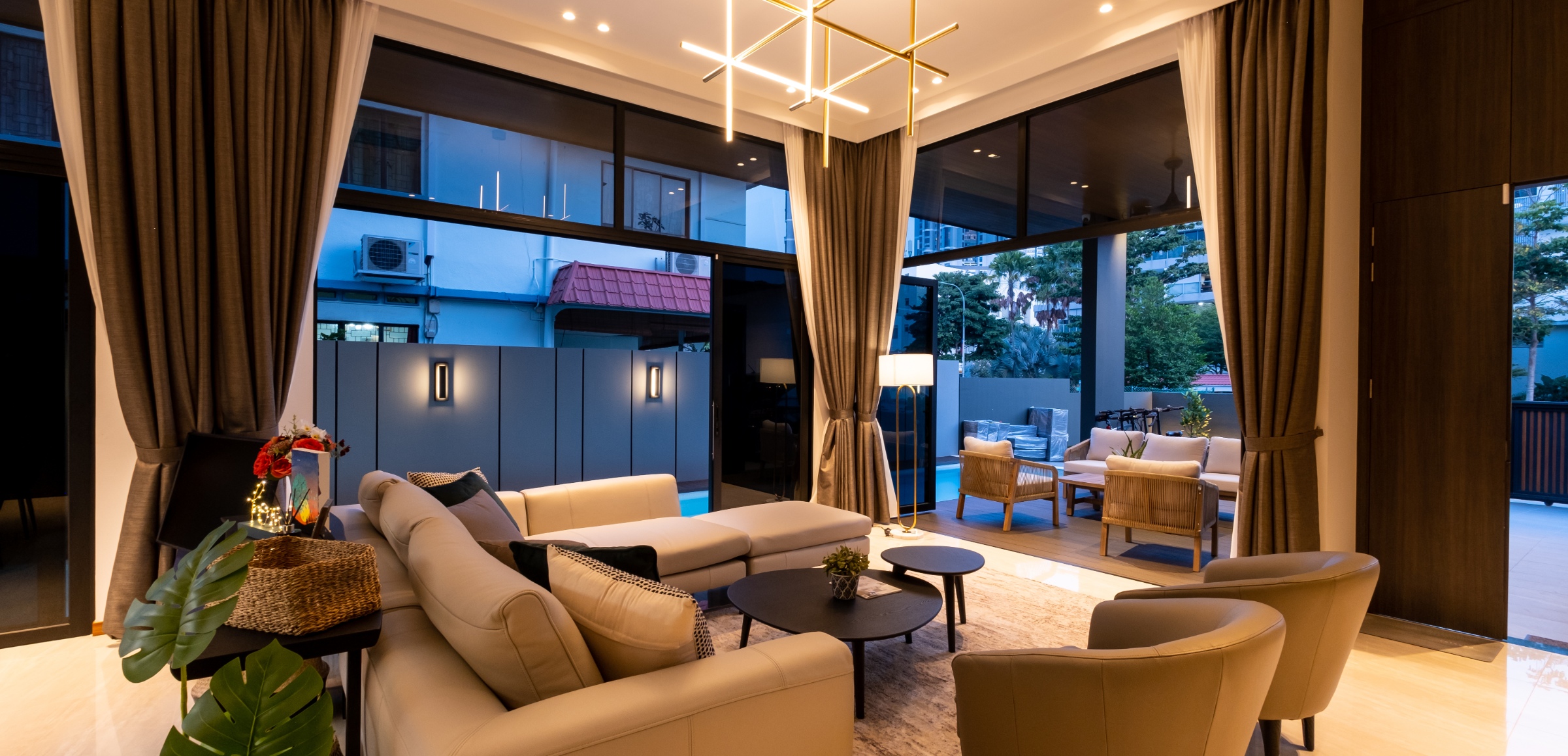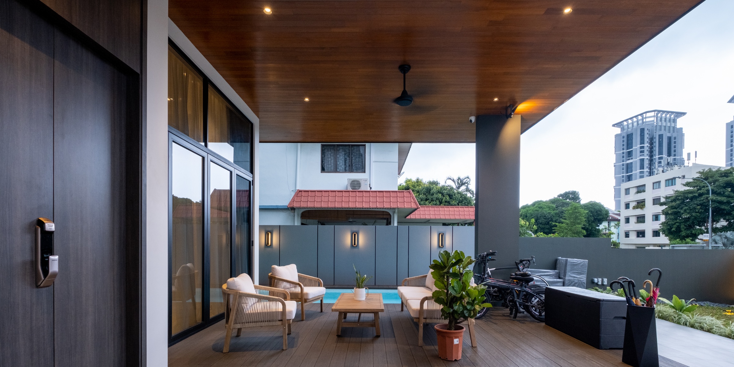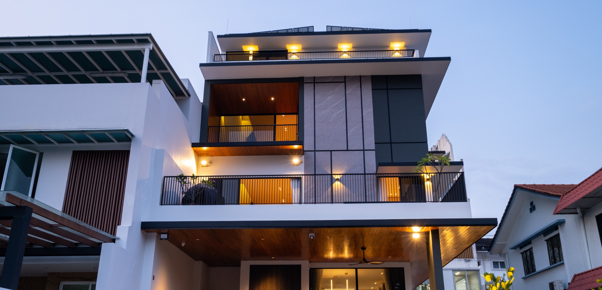 This 3.5-storey residence spans 6,187 sqft and is divided into purposeful levels. The first floor’s open layout encourages gatherings, while the second floor hosts various activities, featuring a game room, guest room, and expansive family area. The upper levels transition into private spaces, including a luxurious master bedroom with an adjoining study at the attic