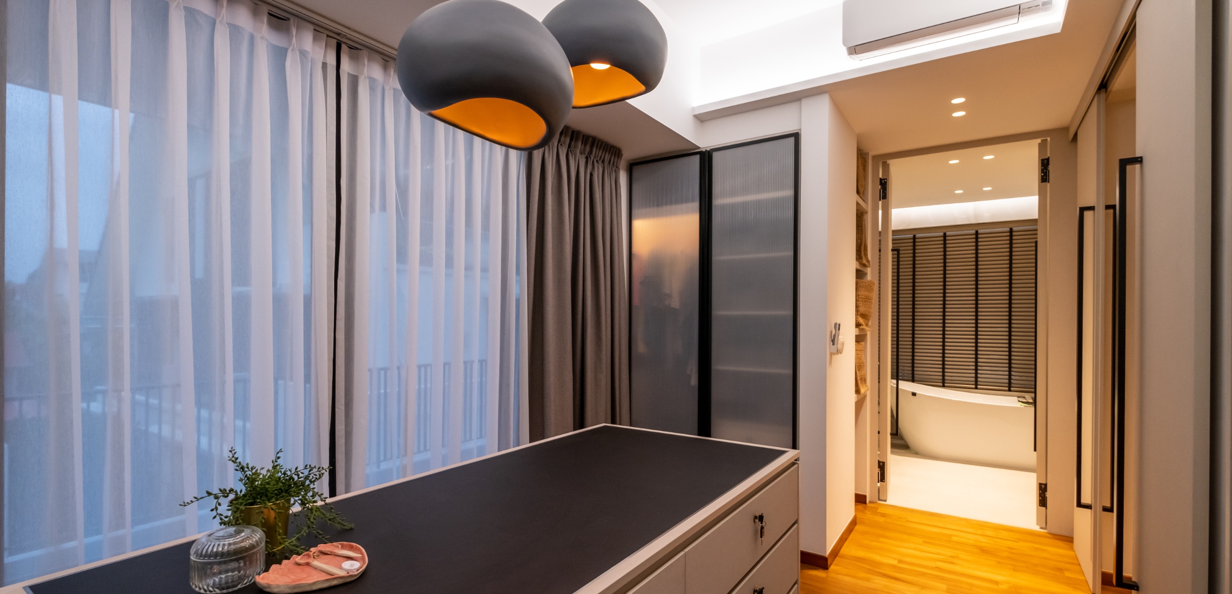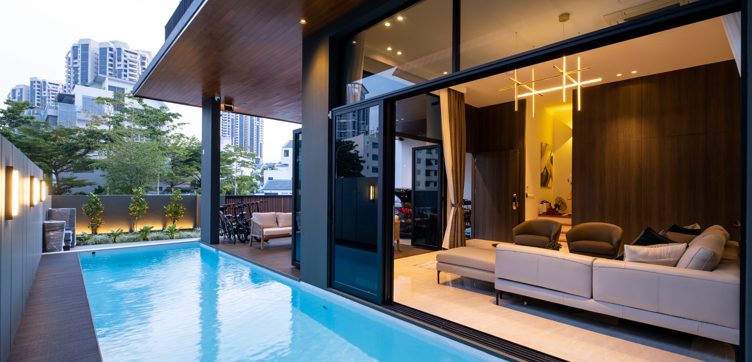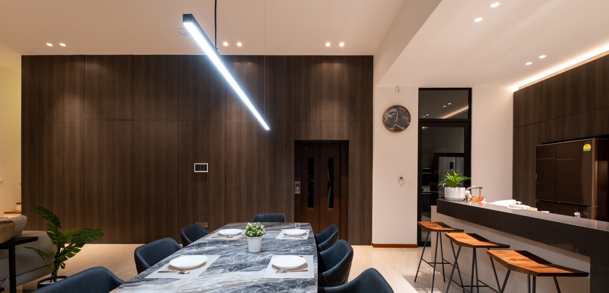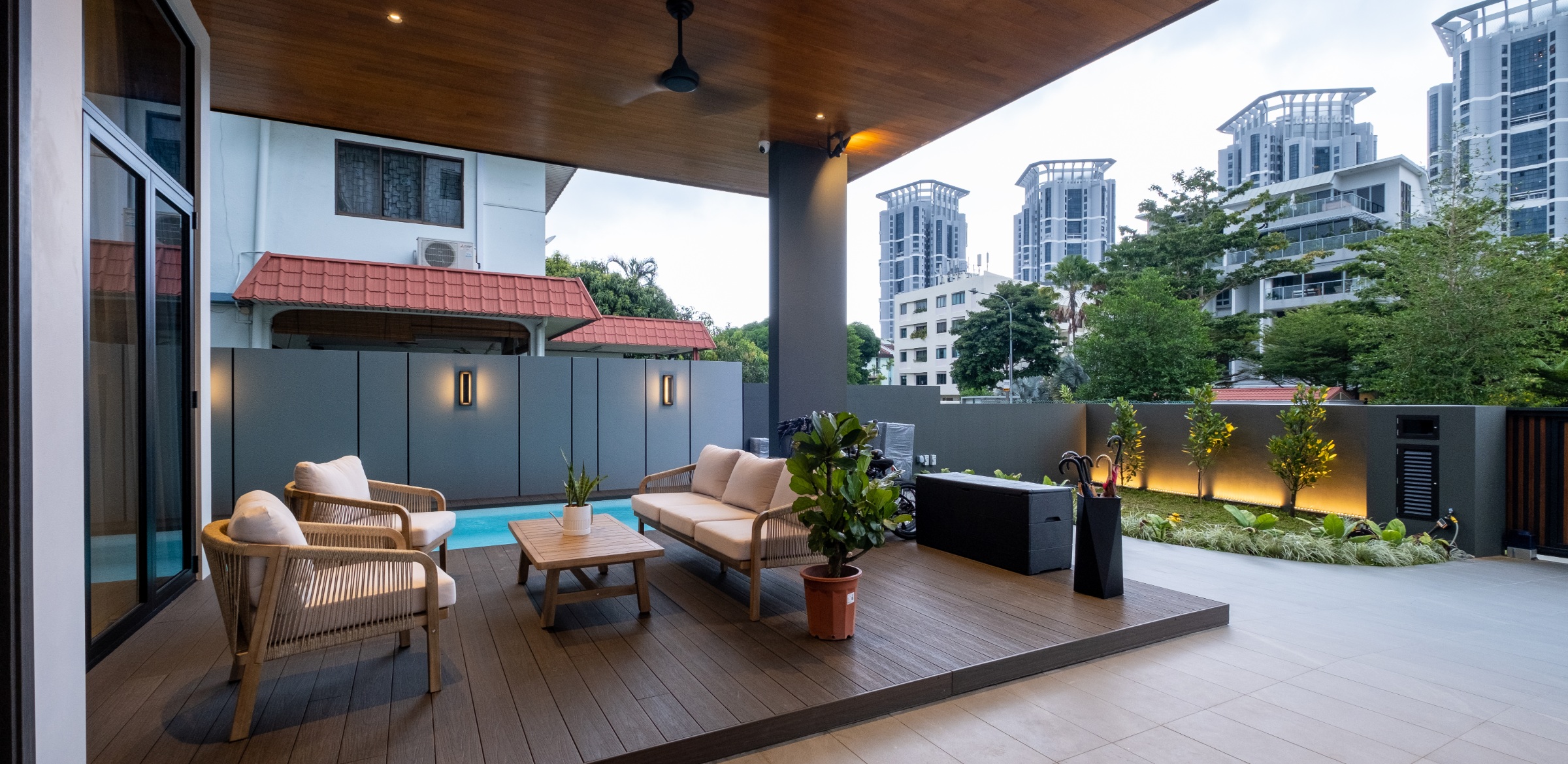 This 3.5-storey residence spans 6,187 sqft and is divided into purposeful levels. The first floor’s open layout encourages gatherings, while the second floor hosts various activities, featuring a game room, guest room, and expansive family area. The upper levels transition into private spaces, including a luxurious master bedroom with an adjoining study at the attic