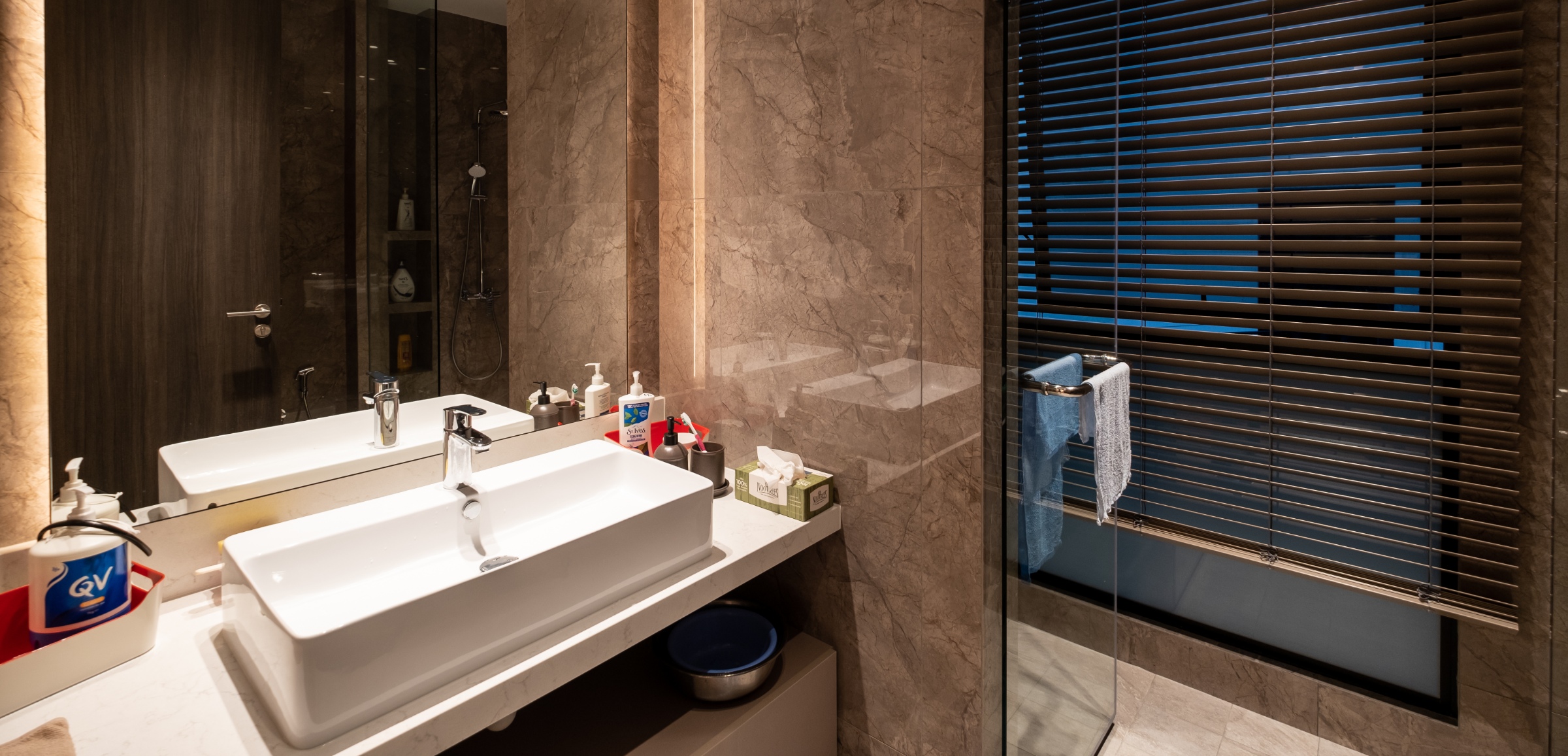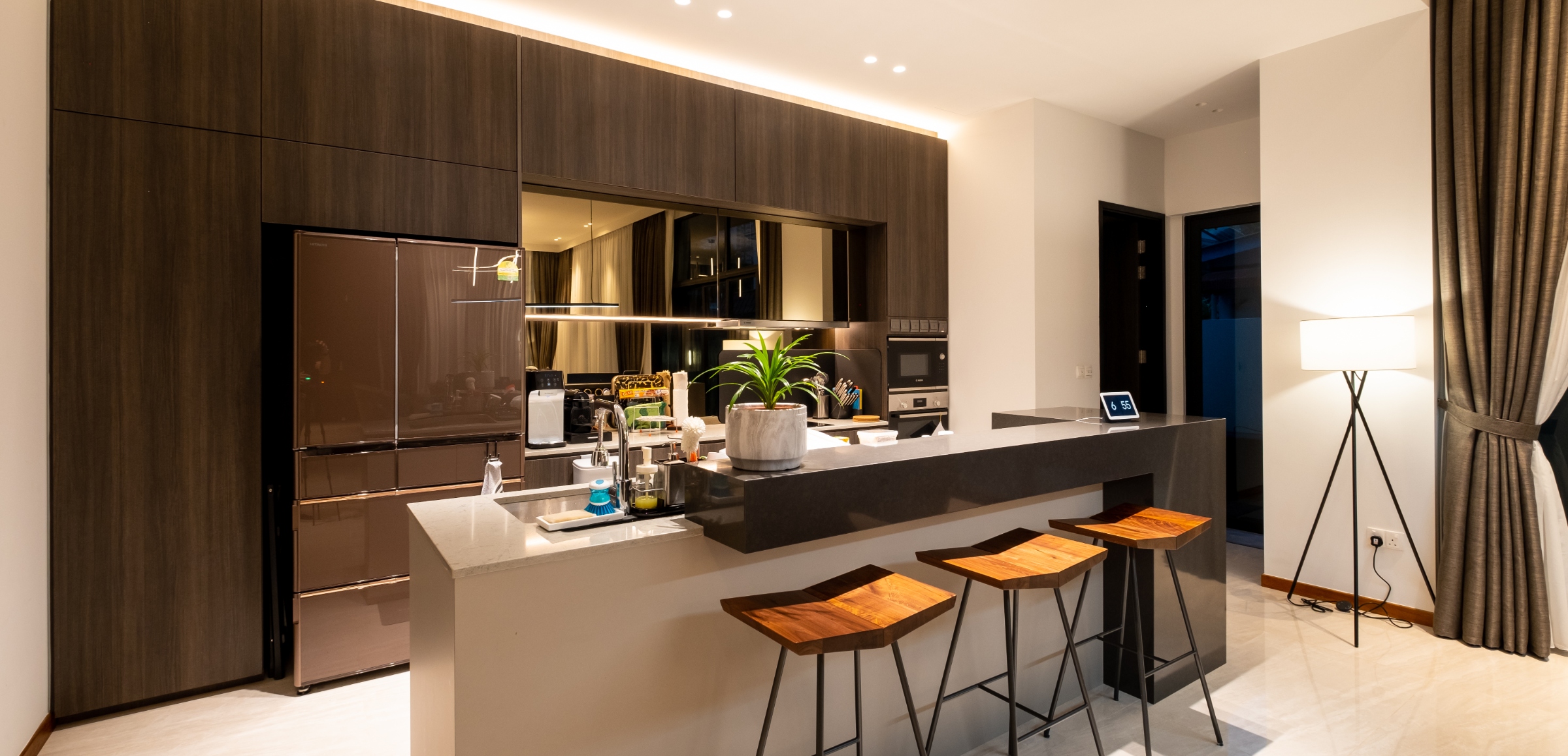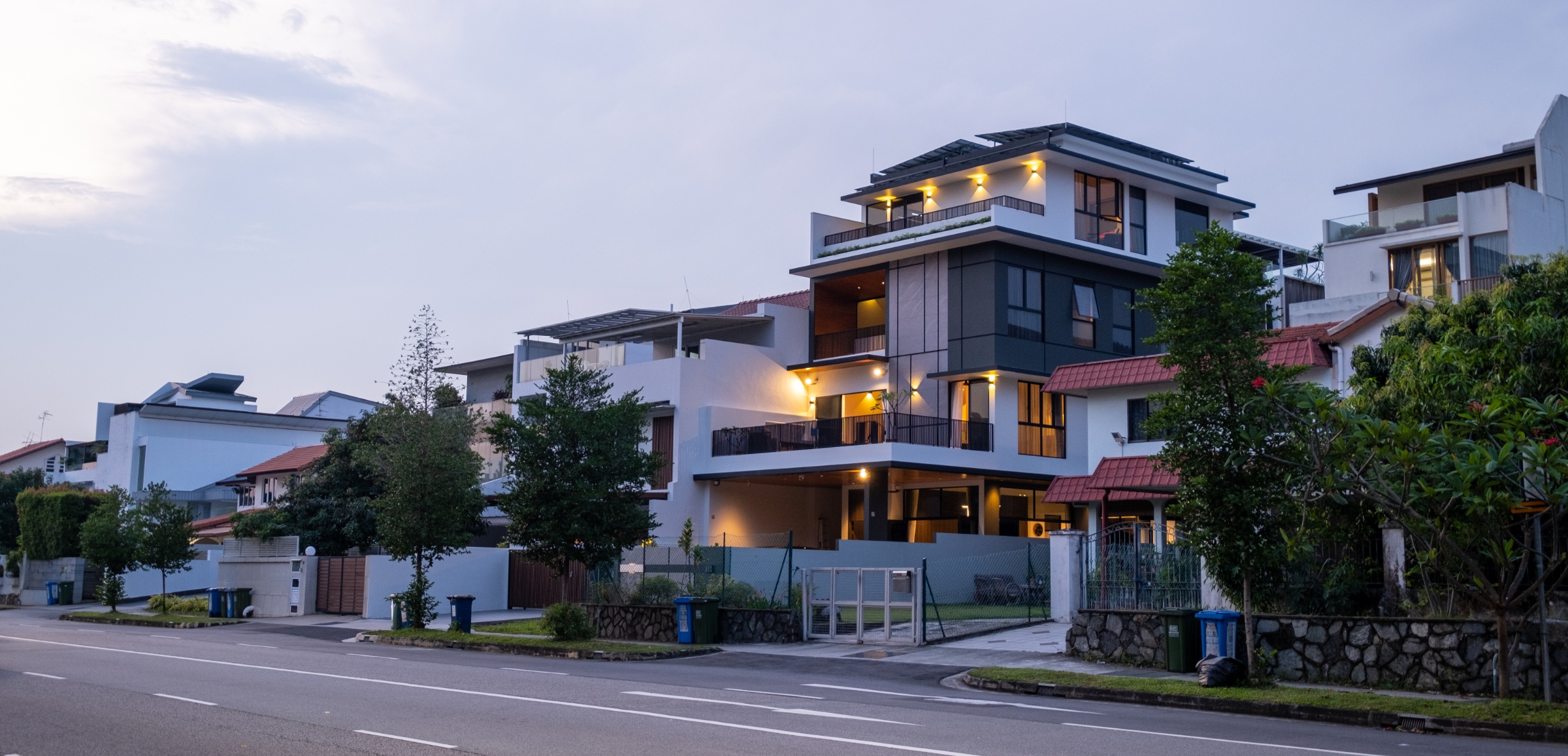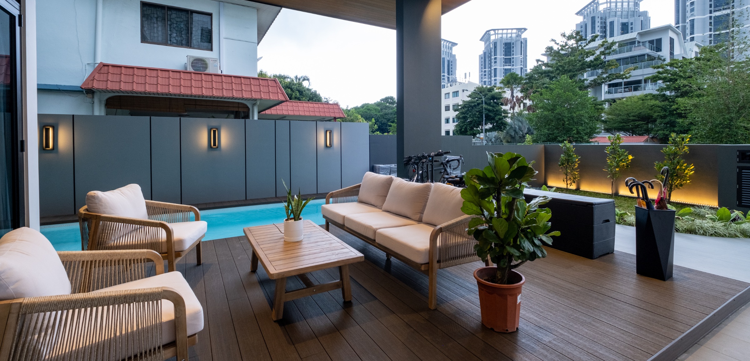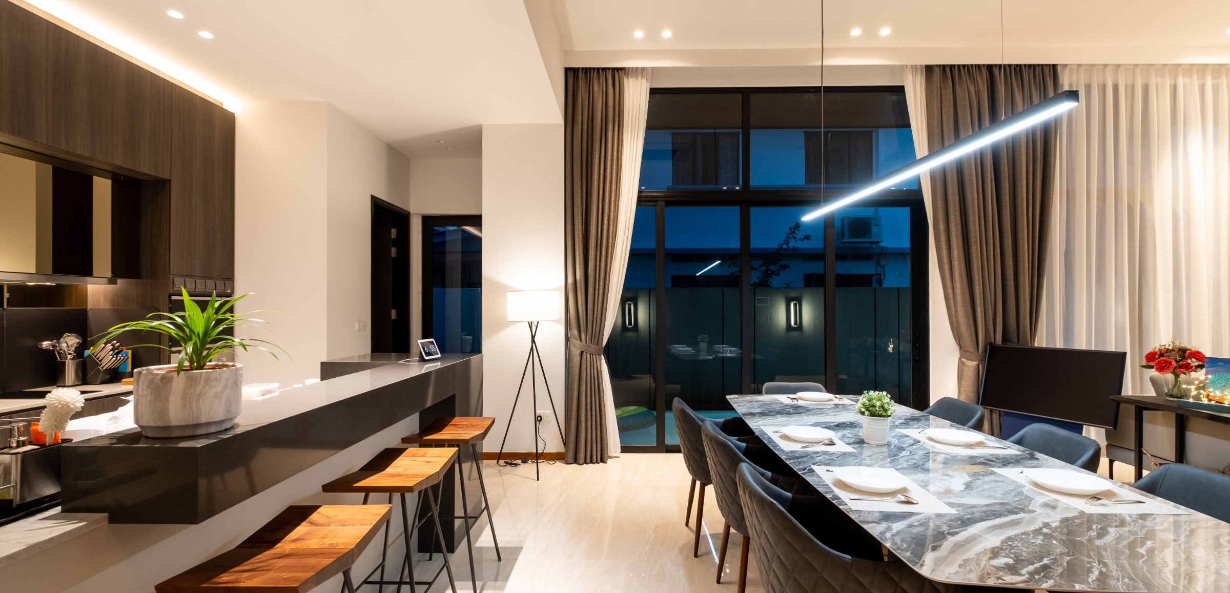 This 3.5-storey residence spans 6,187 sqft and is divided into purposeful levels. The first floor’s open layout encourages gatherings, while the second floor hosts various activities, featuring a game room, guest room, and expansive family area. The upper levels transition into private spaces, including a luxurious master bedroom with an adjoining study at the attic