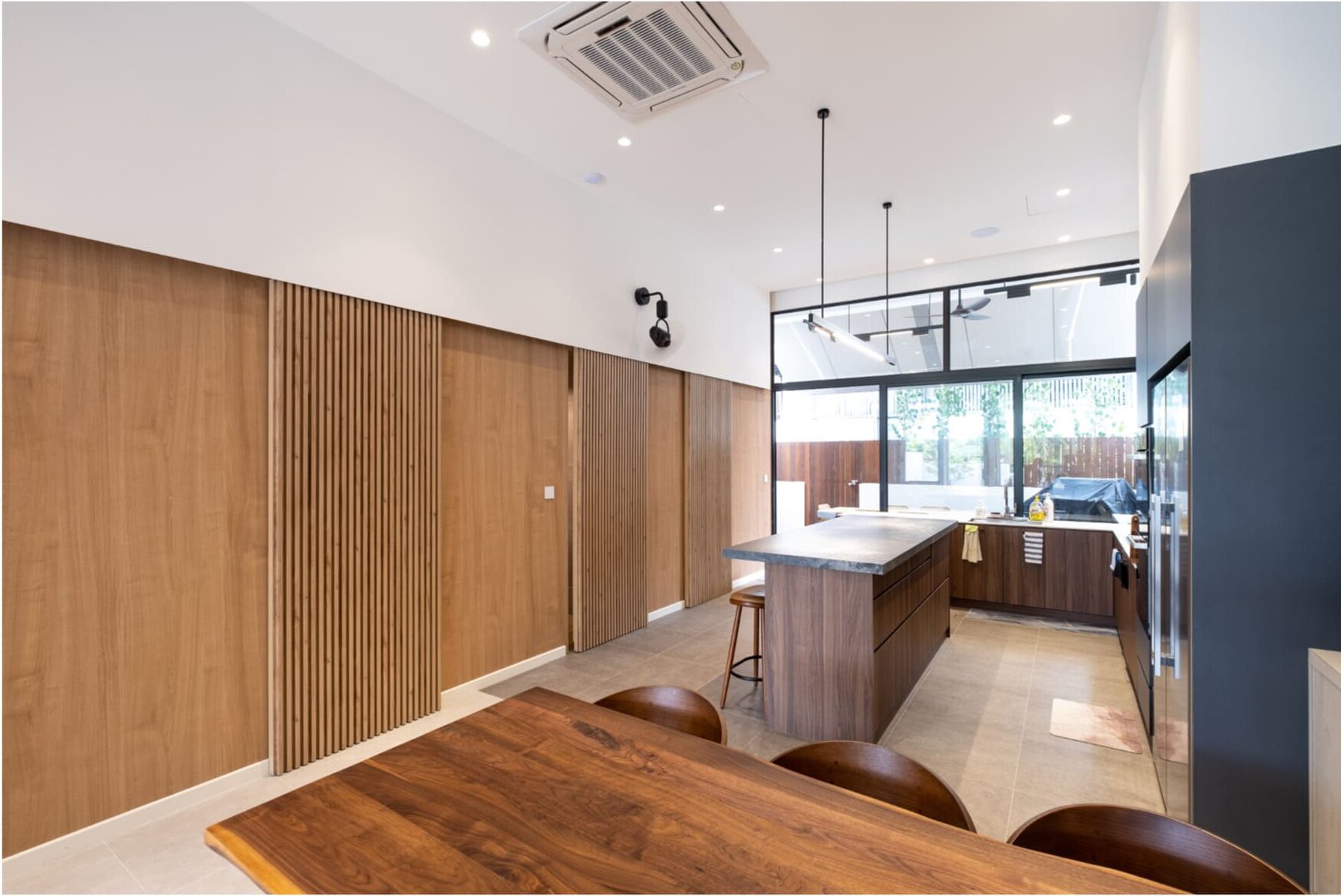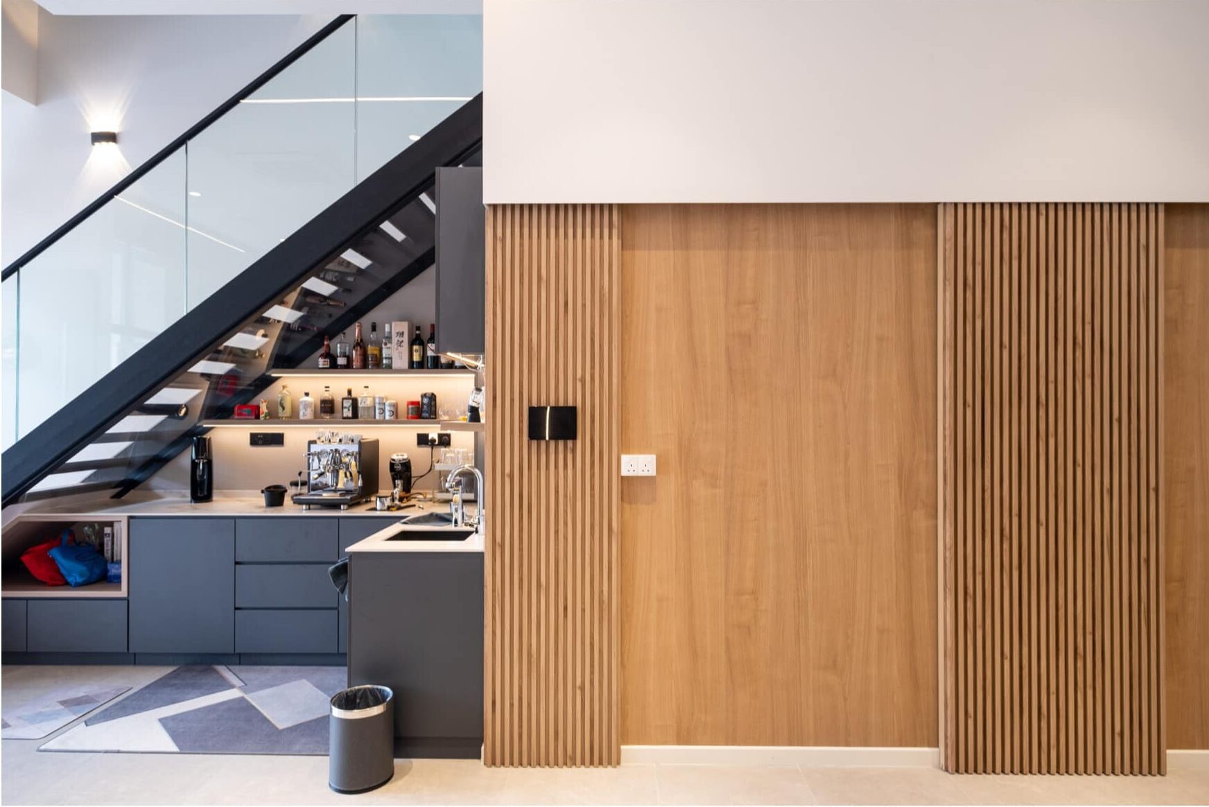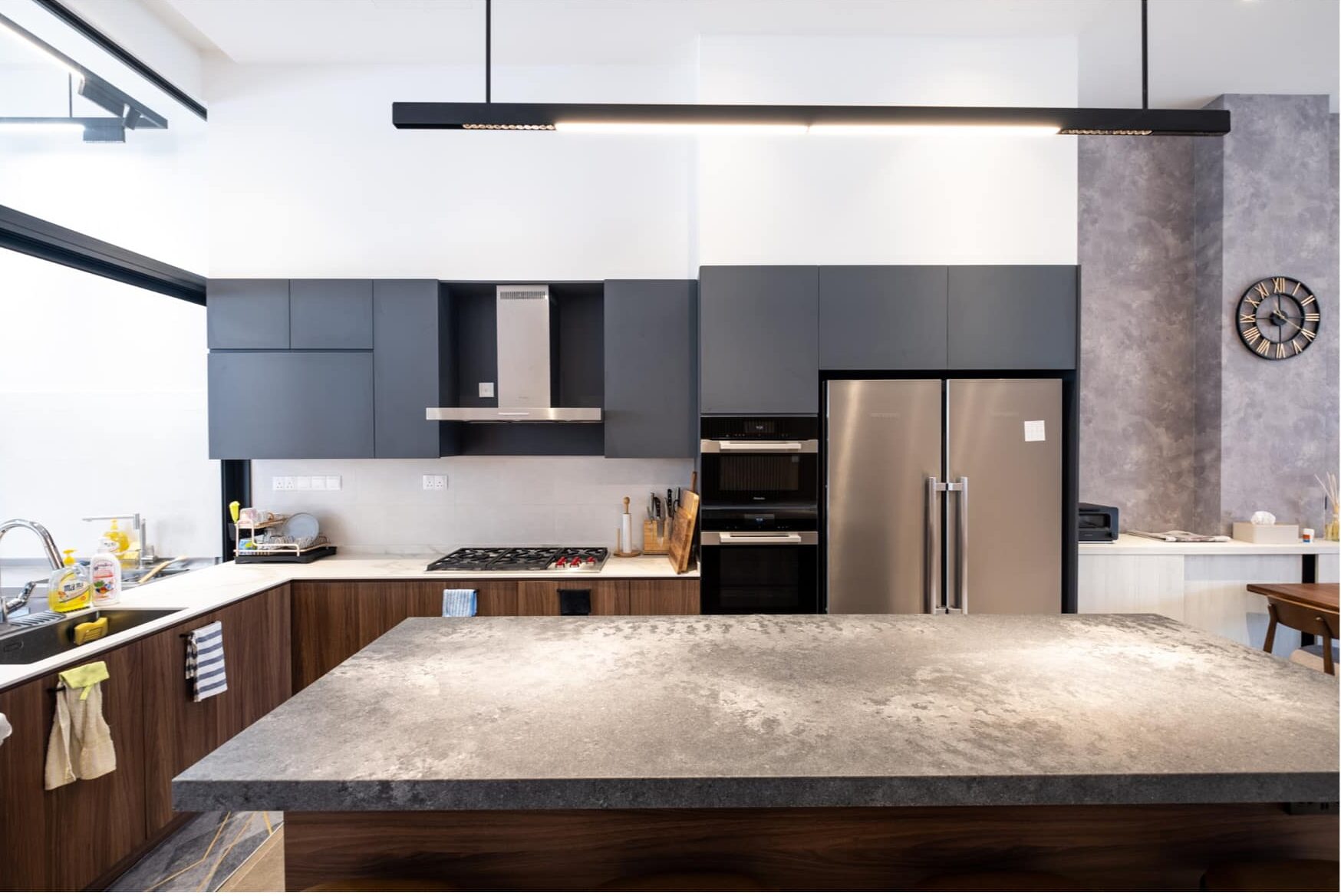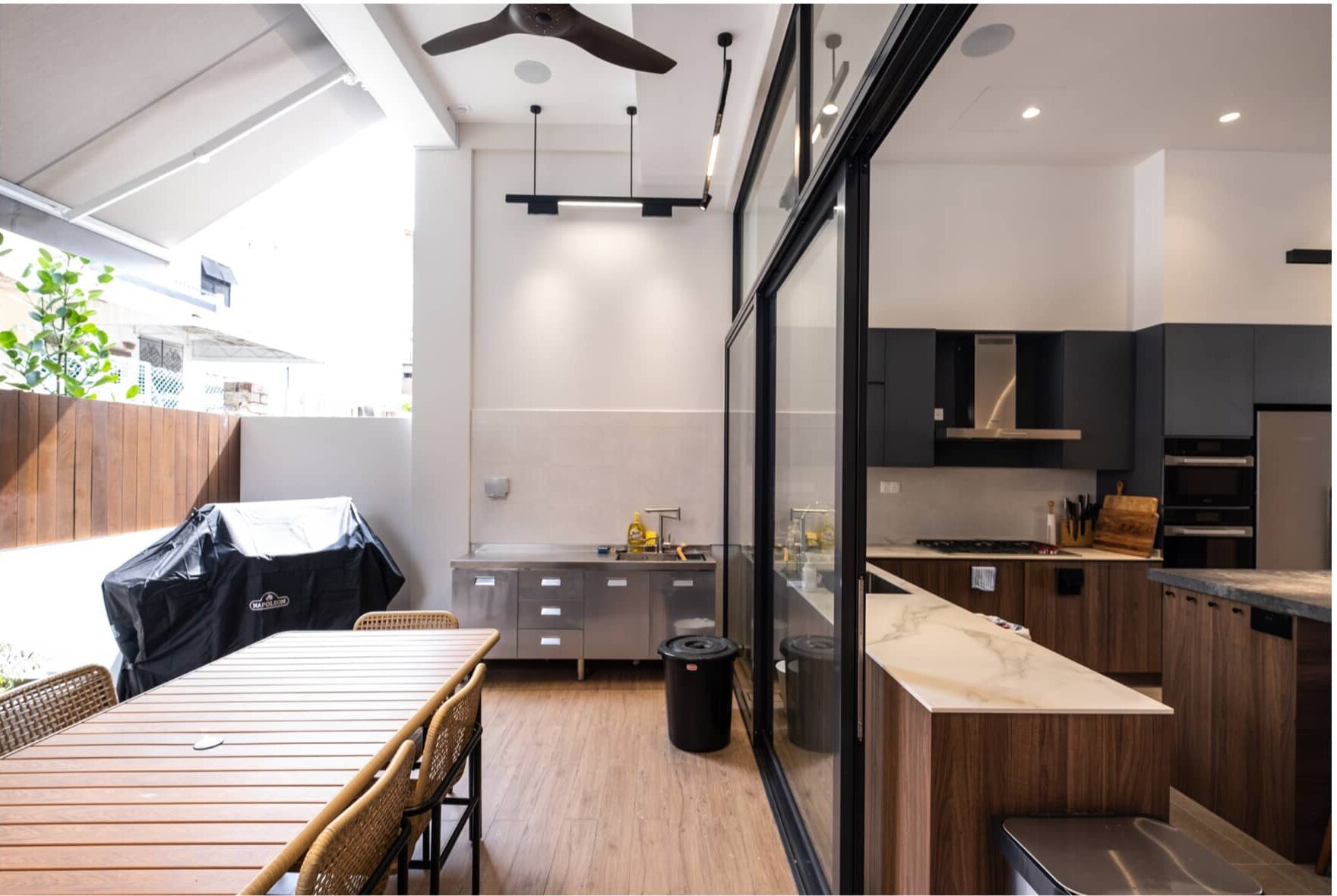 The house features integrated living spaces, to maximize a built-up area of 3,624 sq ft. The first storey emphasizes on hosting, catering to the family's love for gatherings and culinary pursuits. On the upper floors, private spaces were designed for the family, including a dedicated study area, and a functional gym at the attic