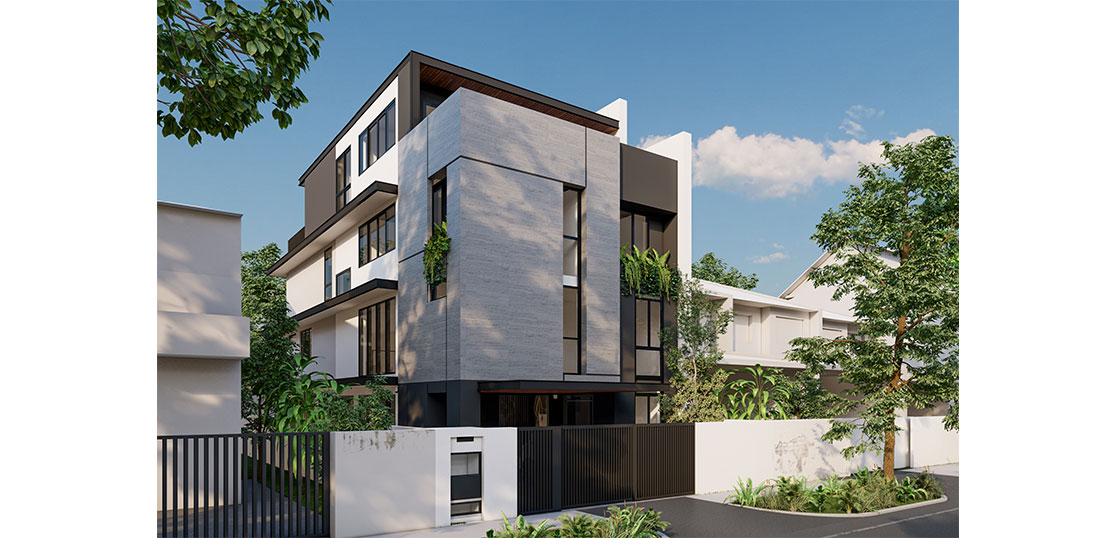 This residence is thoughtfully designed for multi-generational living, featuring six bedrooms. A double volume living space complements the two-storey height windows, creating an airy and spacious environment. The open concept living space integrates the living room, dining room, and kitchen, promoting a fluid and connected living experience. Planter boxes surrounding the house form a rear garden, while an indoor garden under the staircase can be beautifully viewed from the master bathroom. The home also includes an entertainment room, family area, and play area, catering to the diverse needs of a multi-generational family.