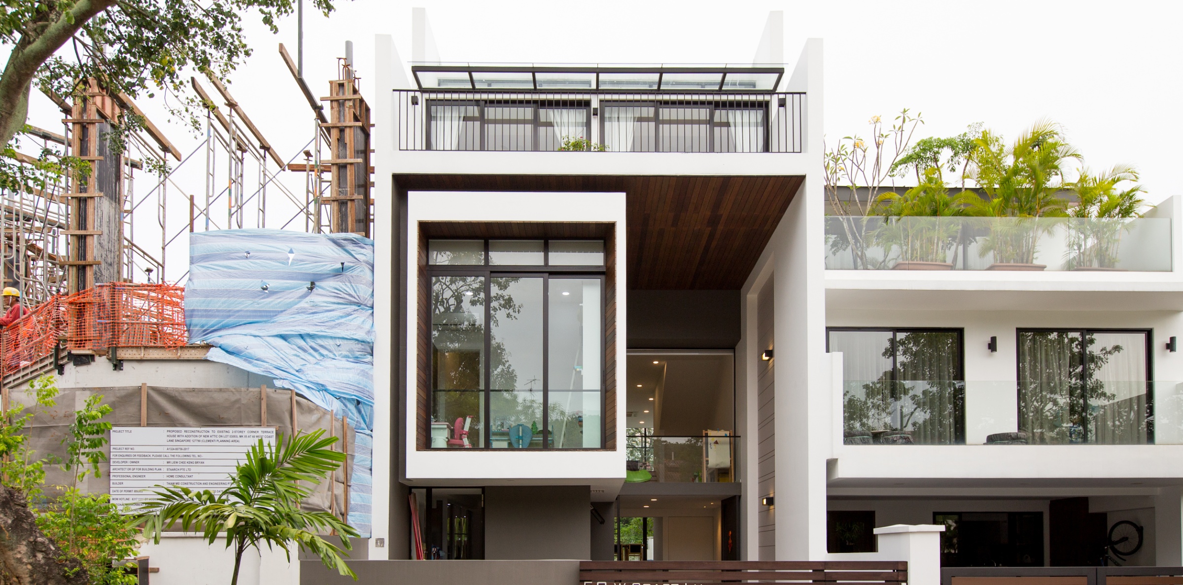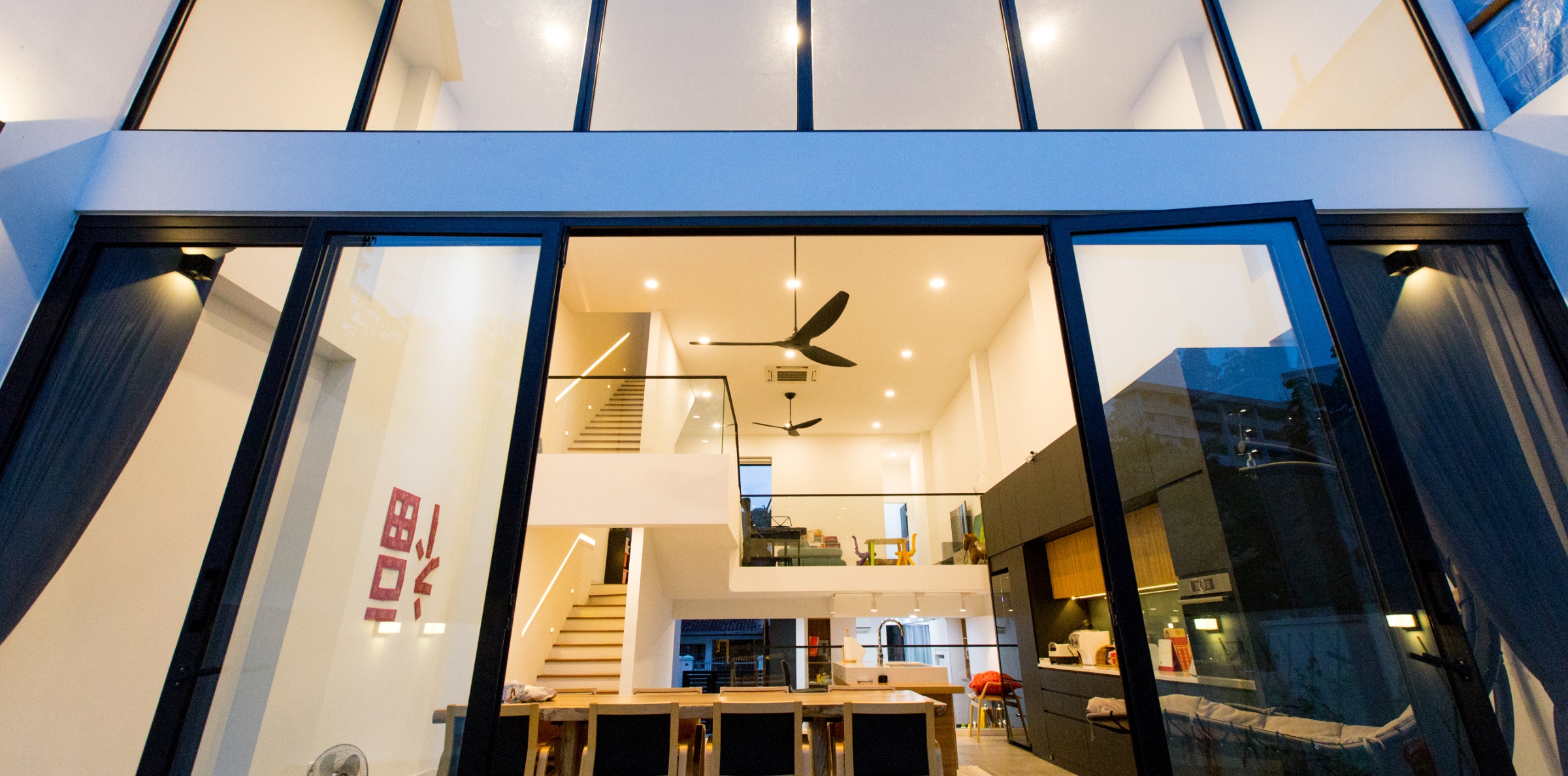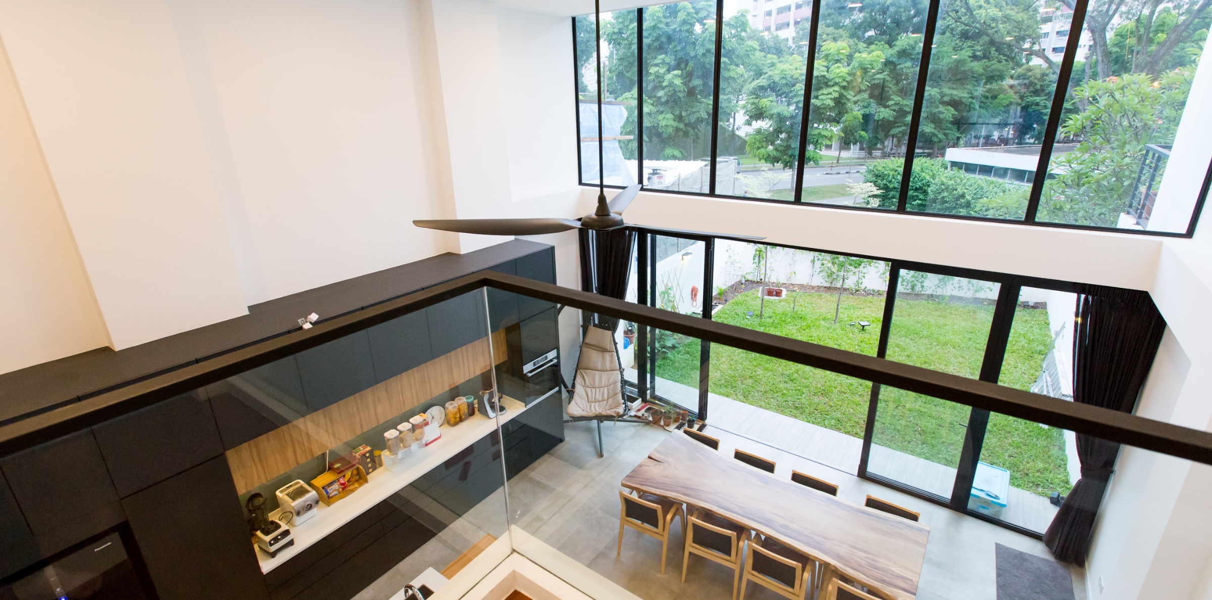 An open design resulted in a distinct external facade, featuring a double volume carporch. This treatment allows the free flow of air from the front of the house, into living and dining spaces. Double volume windows into the courtyard were also designed for the main dining space, which allows light into the mezzanine and ground floors
