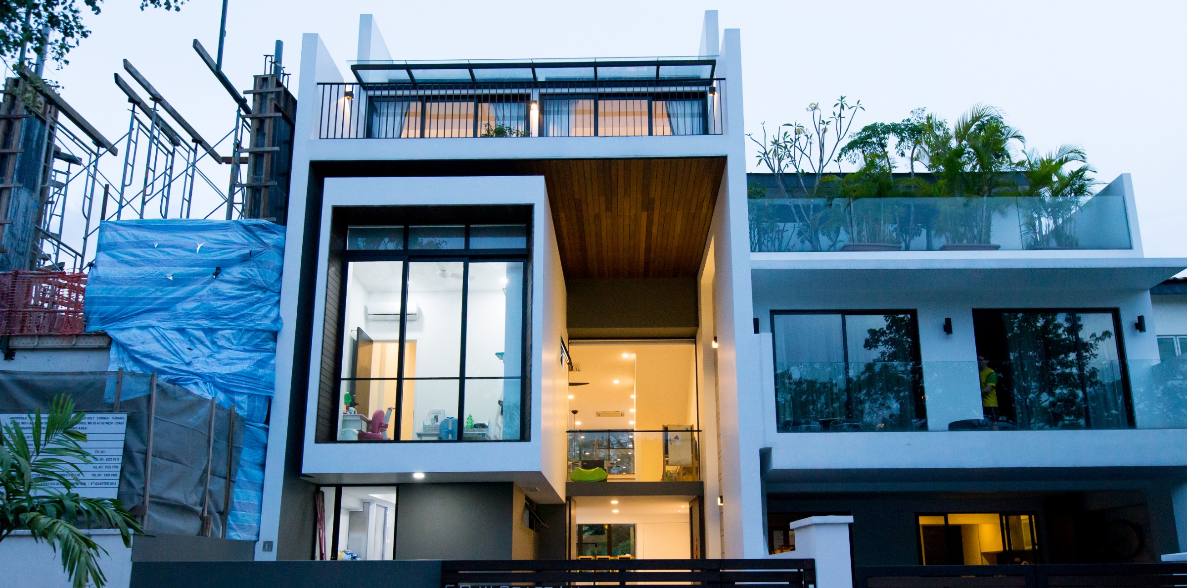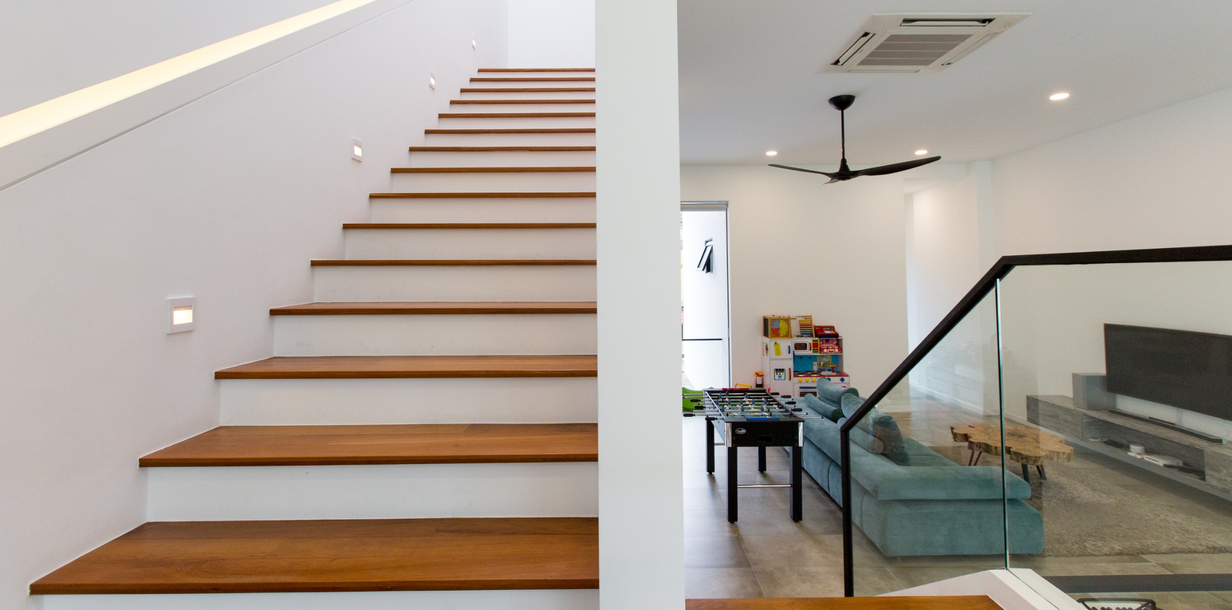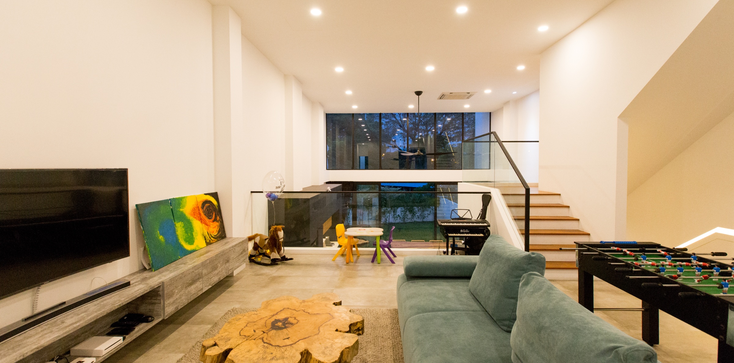 The architecture of this house is inspired by Art Deco, translated using modern design language. Organic curves and timber finishes were used to soften the angular edges, alongside horizontal sun shading and extensive glass panels as a feature at every level. These give the house greater regional context, for a tropical art deco aesthetic